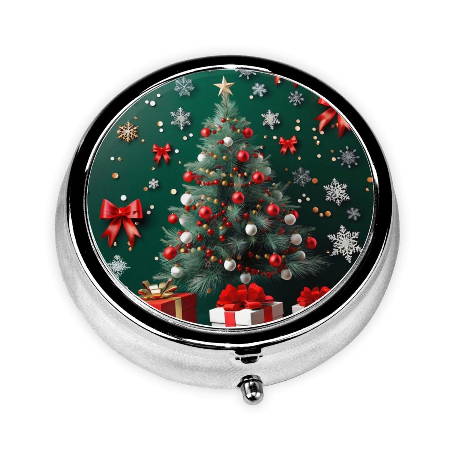 Wide range of applicable scenarios: suitable for use in various occasions such as home, office, and travel, providing you with convenient drug storage solutions. Multi-grid plastic inserts: The medicine box is designed with 3 plastic inserts inside, which can separate and store different types of pills, making them more organized and convenient to use. Convenient opening button design: The medicine box button design is easy to open, convenient and fast, and simple to operate, allowing you to easily access the medicine. Environmentally friendly metal material: Made of environmentally friendly metal iron plating material, it is durable, safe and reliable, and protects medicines from damage. Christmas trees Portable mini design: round mini pill box, measuring 2.0x2.0x0.7 inches, lightweight and portable, suitable for carrying in pockets and purses, providing you with urgently needed medicines anytime and anywhere.