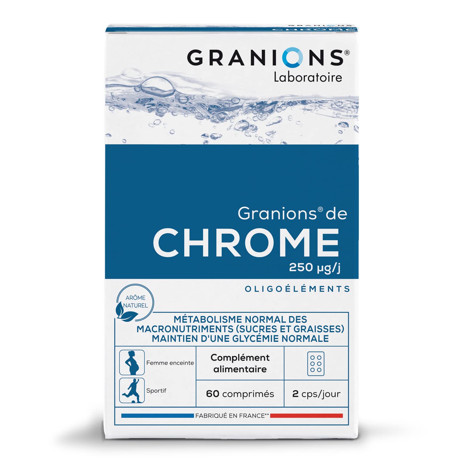 INGREDIENTS: Sweetener: sorbitol, anti-caking agents: microcrystalline cellulose - magnesium stearate, natural orange flavor (maltodextrin - gum arabic), chromium picolinate, thickener: cross-linked sodium carboxymethylcellulose. DIRECTIONS FOR USE: 2 chewable tablets per day, preferably in the morning on an empty stomach. Recommended for use over a 3-month period. PACKAGING: Box of 60 tablets - 30-day program. PRECAUTIONS FOR USE: This food supplement should be used as part of a varied and balanced diet and a healthy lifestyle. In general, it is recommended that elderly people or those with kidney disease, as well as pregnant and breastfeeding women, consult a healthcare professional before taking any supplements. Do not exceed the recommended dose. Excessive consumption may have a laxative effect (sorbitol). Ingredients: Sweetener: sorbitol, anti-caking agents: microcrystalline cellulose - magnesium stearate, natural orange flavor (maltodextrin - gum arabic), chromium picolinate, thickener: cross-linked sodium carboxymethylcellulose. P.when('A').execute(function(A) { A.on('a:expander:toggle_description:toggle:collapse', function(data) { window.scroll(0, data.expander. expander[0].offsetTop-100) }) }) Safety Warning: Keep out of reach of children. See moreCOMPOSITION DAY (2 CAPSULES) Chromium 250 µg (625 percent RI ) Ingredients: Sweetener: sorbitol, anti-caking agents: microcrystalline cellulose – magnesium stearate, natural orange flavor (maltodextrin – gum arabic), chromium picolinate, thickener: cross-linked sodium carboxymethylcellulose. RI : Reference Intakes. TO MAINTAIN GOOD HEALTH, trace elements must be present in the right proportions it's not a question of quantity. LEADING FRENCH PHARMACY BRAND: Laboratoire des Granions, expert in trace element therapy since 1948. Complete range of food supplements, of French quality, developed by our experts. SUITABLE FOR: pregnant women, seniors, athletes, teenagers, and vegetarians. Easy to take: 2 tablets per day. Small chewable tablets. A PROVEN DOSAGE: Scientific studies recognize the effectiveness of Chromium on blood sugar levels starting at 200 µg. ESSENTIAL TRACE ELEMENT: Chromium contributes to the maintenance of normal blood sugar levels. By acting on blood sugar, it regulates feelings of hunger and appetite, thus limiting weight gain. CHROMIUM 250 µg: a pure, high-dose trace element for the normal metabolism of macronutrients (sugars and fats) and the control of hunger (sugar cravings).Description du produit INGRÉDIENTS : Edulcorant : sorbitol, anti-agglomérants : cellulose microcristalline - stéarate de magnésium, arôme naturel orange (maltodextrine - gomme arabique), picolinate de chrome, épaississant : carboxyméthylcellulose de sodium réticulée. CONSEILS D'UTILISATION : 2 comprimés à croquer par jour, de préférence le matin à jeun. Recommandé de l'utiliser sur une durée de 3 mois. CONDITIONNEMENT : Boîte de 60 comprimés - Programme de 30 jours PRÉCAUTIONS D'EMPLOI : Ce complément alimentaire est à utiliser dans le cadre d'une alimentation variée et équilibrée et d'un mode de vie sain. De manière générale, il est recommandé aux personnes âgées ou atteintes de néphropatie ainsi qu'aux femmes enceintes et allaitantes, de consulter un professionnel de santé avant toute complémentation. Ne pas dépasser la dose recommandée. Une consommation excessive peut avoir des effets laxatifs (sorbitol). Ingrédients Edulcorant : sorbitol, anti-agglomérants : cellulose microcristalline - stéarate de magnésium, arôme naturel orange (maltodextrine - gomme arabique), picolinate de chrome, épaississant : carboxyméthylcellulose de sodium réticulée. P.when('A').execute(function(A) { A.on('a:expander:toggle_description:toggle:collapse', function(data) { window.scroll(0, data.expander. expander[0].offsetTop-100) }) }) Avertissement De Sûreté Le produit doit être conservé hors de la portée des enfants Voir plusCOMPOSITION JOUR (2CPS) Chrome 250 µg (625 percentAR ) Ingrédients : Edulcorant : sorbitol, anti-agglomérants : cellulose micro cristalline – stéarate de magnésium, arôme naturel orange (maltodextrine – gomme arabique), picolinate de chrome, épaississant : carboxyméthylcellulose de sodium réticulée. AR :Apports de référence. POUR MAINTENIR UNE BONNE SANTÉ, les oligo elements doivent être présents dans les bonnes proportions, ce n'est pas une question de quantité. MARQUE FRANCAISE LEADER EN PHARMACIE : Laboratoire des Granions, expert en oligothérapie depuis 1948. Gamme complète de compléments alimentaires, de qualité française, développés par nos experts. CONVIENT AUX : femmes enceintes, aux séniors, aux sportifs, aux adolescents et aux végétariens. Facile à prendre : 2 comprimés par jour. Comprimés à croquer de petite taille. UN DOSAGE RECONNU : Des études scientifiques reconnaissent l'efficacité du Chrome sur la glycémie à partir de 200 µg. OLIGO ELEMENT ESSENTIEL : Le Chrome contribue au maintien d'une glycémie normale. En agissant sur la glycémie, il régule la sensation de faim et d'appétit et limite donc la prise de poids. CHROME 250 µg : oligo element unitaire pur, hautement dosé, pour le métabolisme normal des macronutriments (sucres and graisses) et le contrôle de la sensation de faim (besoin sucré).Chrome GRANIONS - 250 µg - Fabriqué en France - Maintien d'une glycémie normale - Coupe Faim - 60 comprimés 60 unité (Lot de 1)