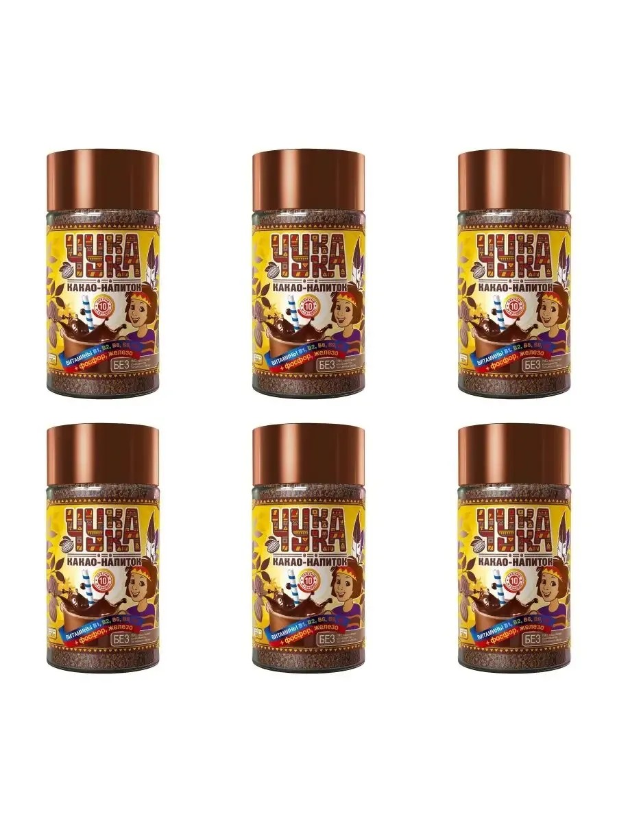 Чукка, Какао , 6 шт по 130 гр. Настоящий какао для физической и умственной активности.Состав: сахар, какао-порошок, мальтодекстрин, ароматизатор (ванилин), эмульгатор (подсолнечный лецитин), соль поваренная пищевая, премикс витаминно-минеральный (витамины:В1,В2, В6, РР, фолиевая кислота, железо, фосфор.Пищевая ценность на 100г продукта: белки - 0,9г, жиры - 0,6г, углеводы - 12,5г.Энергетическая ценность: 60 ккал.Способ приготовления:1. Положить в чашку 2-3 столовые ложки какао-напитка "Чукка".2. Залить горячим или холодным молоком.3. Размешать.