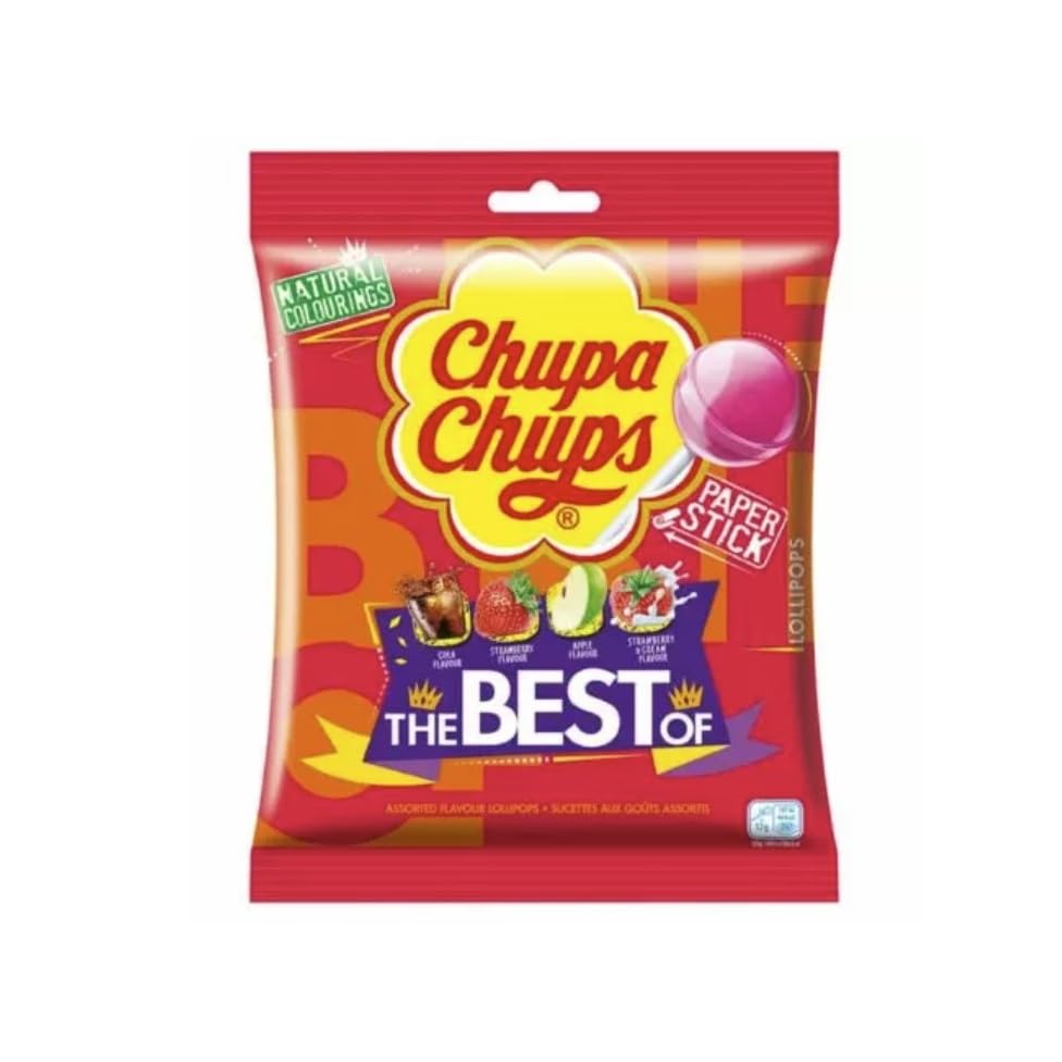 Chupa Chups is the global brand of lollipops children and adults both love. Ideal for any occasion; parties, halloween, offices, in a piñata or as a give-awaym. All lollipops are individually wrapped, promoting hygiene and portion control. Natural Colourings. Assorted Flavour: Strawberry, Apple, Cola and Strawberry-Cream. Pack of 12 lollipops, 12g each (144g Pack).
