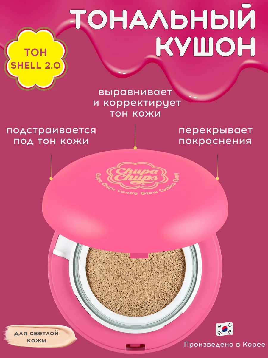 Тональный крем для лица Chupa Chups SPF 50+ в формате кушон отличное средство для декоративного макияжа. Тональная основа для лица из Кореи с жидкой текстурой поможет перекрыть несовершенства кожи такие как высыпания и матирует покраснения, прыщи и акне, а также темные круги и синяки под глазами. Тональный крем является основой макияжа, кушон выравнивает тон лица и выглядит максимально естественно, тоналка перекрывает недостатки и не подчеркивает шелушения. Кушон для лица корея в удобном формате, как компактная крем пудра, имеет удобный спонж для нанесения, ваши руки останутся чистыми после использования тонального средства. Отлично подойдет для путешествий и дороги, поможет привести себя в порядок после тренировки и бассейна. Корейский кушон бренда Чупа Чупс содержит максимальную защиту от солнца и ультрафиолетовых лучей спф 50. Тональный крем Корея содержит натуральный активный состав для ухода за лицом для женщин, девушек и девочек подростков, ухаживая за кожей лица весь день. Тональный крем с гиалуроновой кислотой увлажняет кожу, фруктовый комплекс обогащает витаминами, активоил и эктоин защищают от солнца, ниацинамид выравнивает тон лица. Матирующий тональный крем чупа чупс есть в светлых и более темных оттенках. Тональный крем корея подходит для всех типов кожи, как для жирной и проблемной, так и для сухой и нормальной, в том числе и комбинированной кожи.