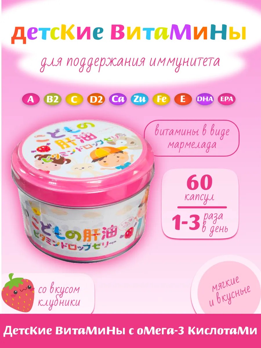 Японский детский витаминный комплекс, который позволяет компенсировать дефицит витаминов В2, А, Е, D2, С. Также в состав входят необходимые растущему организму кальций, железо, лютеин, омега 3 жирные кислоты, экстракт печени акулы (сквален). Идеально подойдет для восстановления детского организма после лечения антибиотиками, при дисбактериозах, однообразном питании, повышенных умственных и физических нагрузках.