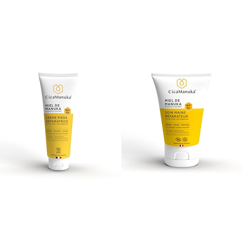 CERTIFIED ORGANIC - Our hand cream is certified organic by ECOCERT and carries the COSMEBIO label. Formulated with 100 naturally derived ingredients and 19.8 organic ingredients. Dermatologically tested. RICH IN MANUKA HONEY IAA - Our hand cream is formulated with 5 Manuka honey IAA 15 , renowned for its restorative and protective properties, and 100 naturally derived ingredients: shea butter, olive oil, etc. NOURISHES AND HYDRATES - Our hand cream is formulated to intensely nourish and hydrate hands damaged and dried out by the cold and promote skin repair. Its non-greasy texture absorbs quickly and is non-sticky for immediate comfort. [MANUKA HONEY]: Certified by the IAA index, our honey boasts unique activity, with an exceptional concentration of methylglyoxal (MGO), providing antibacterial action and promoting the repair of the skin's surface layers. Cicamanuka Repairing Foot Cream contains 5 active IAA15 Manuka honey. Formulated without parabens, it has a soft and pleasant honey scent. [VISIBLE RESULTS]: This repairing foot treatment intensely nourishes the skin for 100 of users and repairs damaged or cracked heels for 97 of them. It leaves skin soft, supple, and soothed for 100 of users. Feelings of discomfort are reduced. [REPAIRS – NOURISHES – SOOTHES]: This repairing foot cream with Manuka honey IAA15 , a natural antibacterial active ingredient, intensely nourishes, hydrates, and soothes dry to very dry feet for immediate comfort. It reduces calluses, repairs damaged and chapped heels, and helps prevent cracks. Its odor-fighting action provides a true sense of well-being. Practical and effective, it absorbs quickly into the skin, allowing you to put on your shoes shortly after application. Its smooth, non-sticky texture ensures optimal comfort.CicaManuka - Crème pieds réparatrice au miel de Manuka IAA15 Répare les talons abîmés secs Certifié Cosmos Natural 75ml Soin mains réparateur au miel de Manuka IAA15 - Nourrit et hydrate - 50mlCERTIFIÉ BIO - Notre soin mains est certifié biologique par ECOCERT et labellisé COSMEBIO. Formulé avec 100 d'ingrédients d'origine naturelle et 19,8 d'ingrédients issus de l'agriculture biologique. Testé sous contrôle dermatologique. RICHE EN MIEL DE MANUKA IAA - Notre soin main est formulé avec 5 de miel de Manuka IAA 15 reconnu pour ses propriétés réparatrices et protectrices et d'ingrédients 100 d'origine naturelle : beurre de karité, huile d'olive…. NOURRIT ET HYDRATE - Notre soin mains est formulé pour nourrir et hydrater intensément les mains agressées et desséchées par le froid et favoriser la réparation cutanée. Sa texture non grasse pénètre rapidement la peau et ne colle pas pour un confort immédiat. [LE MIEL DE MANUKA] : Certifié par l'indice IAA, notre miel présente une activité unique, avec une concentration exceptionnelle en methylglyoxal (MGO), offrant ainsi une action antibactérienne et favorisant la réparation des couches superficielles de la peau. La crème pieds réparatrice Cicamanuka est composée de 5 de miel de Manuka actif IAA15 . Formulée sans parabènes, elle possède un parfum doux et agréable de miel. [DES RÉSULTATS VISIBLES] : Ce soin réparateur pour les pieds nourrit intensément la peau pour 100 des utilisateurs et répare les talons abimés ou fendillés pour 97 d'entre eux. Il laisse la peau douce, souple et apaisée pour 100 des personnes l'ayant utilisé. Les sensations d'inconfort sont diminuées. [RÉPARE – NOURRIT – APAISE] : La crème pieds réparatrice au miel de Manuka IAA15 , actif antibactérien naturel, nourrit, hydrate intensément et soulage les pieds secs à très secs pour une sensation de confort immédiat. Elle réduit les callosités, répare les talons abîmés et tiraillés et aide à prévenir des crevasses. Son action anti-odeur apporte un véritable bien-être. Pratique et efficace, elle pénètre rapidement la peau, permettant de se chausser peu de temps après l'application. Sa texture onctueuse ne colle pas pour un confort d'utilisation optimal.
