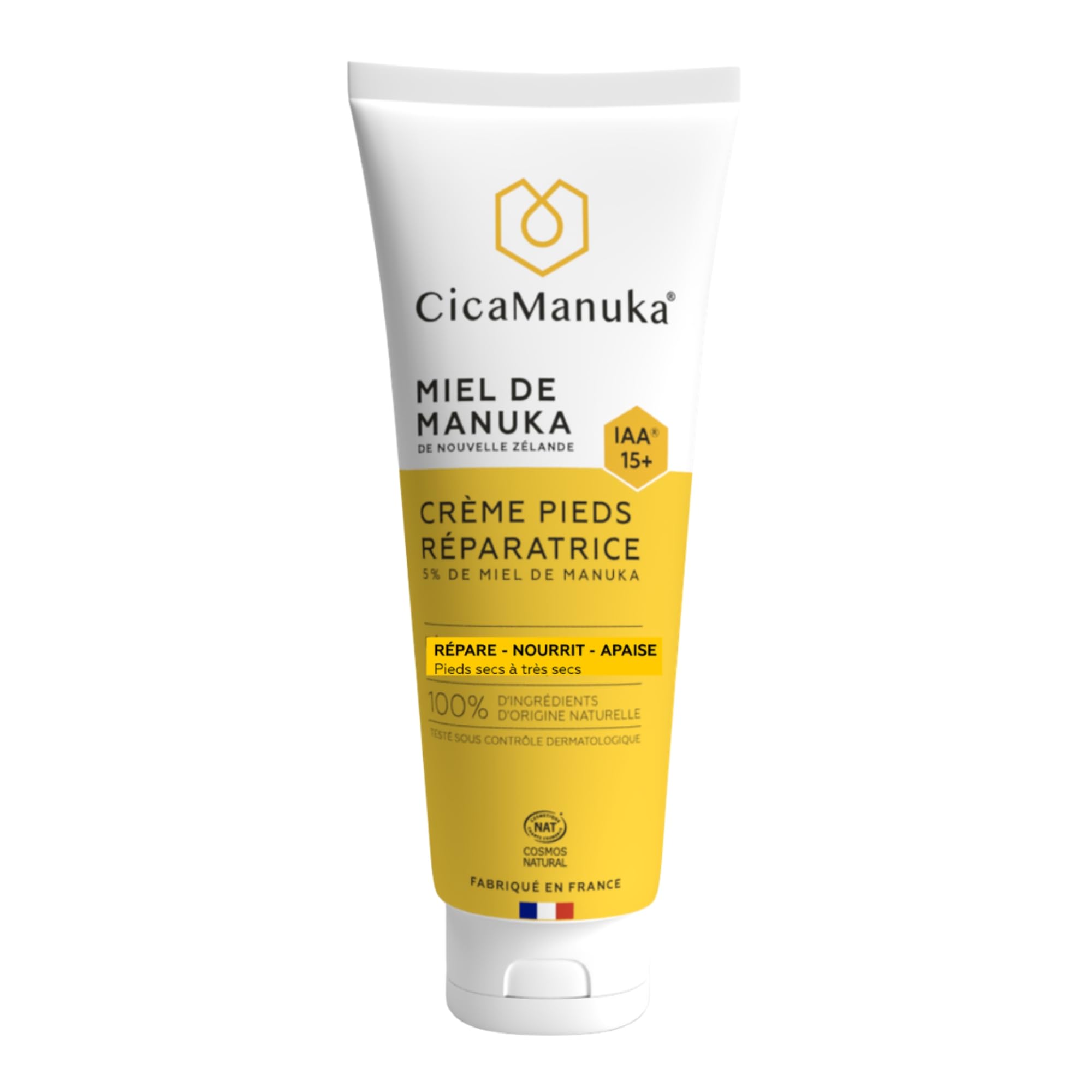 Cicamanuka restorative foot cream nourishes, hydrates and relieves dry feet, damaged heels and helps prevent cracks. Its formula is enriched with IAA15 Manuka honey with restorative and protective properties combined with organic and natural ingredients. Its creamy texture penetrates quickly and does not stick. Find suppleness and softness thanks to this daily treatment for protected skin all day long! The IAA index of Manuka honey corresponds to its exceptional concentration of methylglyoxal which promotes skin repair. Its activity is scientifically guaranteed by this index recognized in France. All Cicamanuka formulas are dermatologically tested and are developed and manufactured in France. INGREDIENTS AQUA (WATER), GLYCERIN, GLUCONOLACTONE, GLYCERYL STEARATE, MEL (HONEY), BUTYROSPERMUM PARKII (SHEA) BUTTER , SQUALANE, OCTYLDODECANOL, CETEARYL ALCOHOL, BEHENYL ALCOHOL, SODIUM CITRATE, ORYZA SATIVA (RICE) HULL POWDER, CITRIC ACID, PARFUM (FRAGRANCE), SODIUM HYDROXIDE, LEVULINIC ACID, SODIUM CETEARYL SULFATE, XANTHAN GUM, PHENETHYL ALCOHOL, ALOE BARBADENSIS LEAF JUICE POWDER , SODIUM LEVULINATE, TOCOPHEROL. DIRECTIONS FOR USE Apply daily to clean, dry feet. Insist on dry areas and heels. Without rinsing. SAFETY WARNING Apply daily to clean, dry feet. Apply by massaging gently and insisting on very dry areas and heels. Without rinsing. From 3 years. Suitable for pregnant and breastfeeding women. Avoid contact with eyes. Reserved for external use. Store away from heat. [INSTRUCTIONS FOR USE]: Apply daily to clean, dry feet. Massage in gently, paying particular attention to very dry areas and heels. No rinsing required. Suitable for ages 3 and up. Suitable for pregnant and breastfeeding women. Avoid contact with eyes. For external use only. Store away from heat. [100 NATURAL INGREDIENTS]: Our foot care is certified ecological and organic by ECOCERT Greenlife. It is formulated with 100 natural ingredients and 24 ingredients from Organic Farming. Dermatologically tested, it is perfectly suited to very dry feet for the whole family, ages 3 and up. We develop and manufacture our products in France, in collaboration with local partners and dermatology specialists. Combine naturalness and effectiveness with CicaManuka! [MANUKA HONEY]: Certified by the IAA index, our honey has a unique activity, with an exceptional concentration of methylglyoxal (MGO), thus providing an antibacterial action and promoting the repair of the superficial layers of the skin. Cicamanuka restorative foot cream is composed of 5 active IAA15 Manuka honey. Formulated without parabens, it has a sweet and pleasant honey scent. [VISIBLE RESULTS]: This restorative foot treatment intensely nourishes the skin for 100 of users and repairs damaged or cracked heels for 97 of them. It leaves the skin soft, supple and soothed for 100 of people who have used it. Feelings of discomfort are reduced. [REPAIRS – NOURISHES – SOOTHES]: The restorative foot cream with IAA15 Manuka honey, a natural antibacterial active ingredient, nourishes, intensely moisturizes and soothes dry to very dry feet for an immediate feeling of comfort. It reduces calluses, repairs damaged and tight heels and helps prevent cracks. Its anti-odor action brings real well-being. Practical and effective, it penetrates the skin quickly, allowing you to put on shoes shortly after application. Its creamy texture is non-sticky for optimal comfort of use. La crème pieds réparatrice Cicamanuka nourrit, hydrate et soulage les pieds secs, les talons abîmées et aide à prévenir des crevasses. Sa formule est enrichie en miel de Manuka IAA15 aux propriétés réparatrices et protectrices associée à des ingrédients bio et d'origine naturelle. Sa texture onctueuse pénètre rapidement et ne colle pas. Retrouvez souplesse et douceur grâce à ce soin quotidien pour une peau protégée toute la journée ! L'indice IAA du miel de Manuka correspond à sa concentration exceptionnelle en méthylglyoxal qui favorise la réparation de la peau. Son activité est scientifiquement garantie par cet indice reconnu en France. Toutes les formules Cicamanuka sont testées dermatologiquement et sont élaborées et fabriquées en France. INGRÉDIENTS AQUA (WATER), GLYCERIN, GLUCONOLACTONE, GLYCERYL STEARATE, MEL (HONEY), BUTYROSPERMUM PARKII (SHEA) BUTTER , SQUALANE, OCTYLDODECANOL, CETEARYL ALCOHOL, BEHENYL ALCOHOL, SODIUM CITRATE, ORYZA SATIVA (RICE) HULL POWDER, CITRIC ACID, PARFUM (FRAGRANCE), SODIUM HYDROXIDE, LEVULINIC ACID, SODIUM CETEARYL SULFATE, XANTHAN GUM, PHENETHYL ALCOHOL, ALOE BARBADENSIS LEAF JUICE POWDER , SODIUM LEVULINATE, TOCOPHEROL. MODE D'EMPLOI Appliquer quotidiennement sur des pieds propres et secs. Insister sur les zones sèches et les talons. Sans rinçage. AVERTISSEMENT DE SÛRETÉ Appliquer quotidiennement sur des pieds propres et secs. Faire pénétrer en massant doucement et en insistant sur les zones très sèches et les talons. Sans rinçage.Dès 3 ans. Convient aux femmes enceintes et allaitantes. Éviter le contact avec les yeux. Réservé à l'usage externe. Conserver à l'abri de la chaleur. [CONSEILS D'UTILISATION] : Appliquer quotidiennement sur des pieds propres et secs. Faire pénétrer en massant doucement et en insistant sur les zones très sèches et les talons. Sans rinçage.Dès 3 ans. Convient aux femmes enceintes et allaitantes. Éviter le contact avec les yeux. Réservé à l'usage externe. Conserver à l'abri de la chaleur. [100 D'INGRÉDIENTS D'ORIGINE NATURELLE] : Notre soin pieds est certifié écologique et biologique par ECOCERT Greenlife. Elle est formulée avec 100 d'ingrédients d'origine naturelle 24 d'ingrédients issus de l'Agriculture Biologique. . Testée sous contrôle dermatologique, elle est parfaitement adaptée aux pieds très secs de toute la famille dès 3 ans. Nous développons et fabriquons nos produits en France, en collaboration avec des partenaires locaux et des spécialistes de la dermatologie. Alliez le naturel à