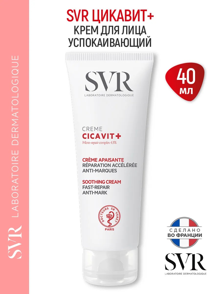 | Комплектация | SVR Cicavit + успокаивающий Крем регенерирующий для лица и тела, 40 мл СВР Цикавит Плюс |