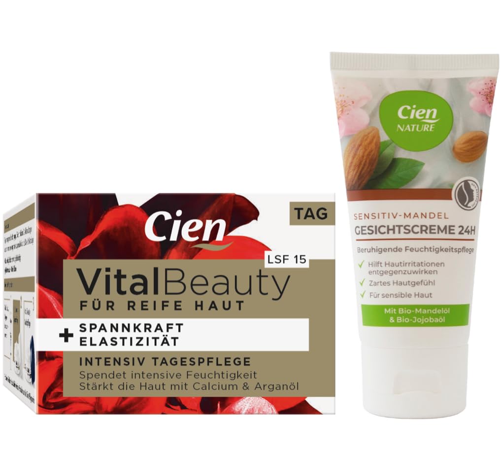 Cien Vital Beauty Day Cream - Directions for use: Apply daily in the morning after cleansing to the face, neck, and décolleté and massage gently. Avoid the eye area. Also ideal as a makeup base. Skin tolerance dermatologically tested. pH neutral. Silicone-free. Ingredients: Aqua, Dibutyl Adipate, Glycerin, Glyceryl Stearate SE, Ethylhexyl Salicylate, Dicaprylyl Ether, Cetearyl Alcohol, Glycine Soja Oil, Ethylhexyl Triazone, Butyl Methoxydibenzoylmethane, Bis-Ethylhexyloxyphenol Methoxyphenyl Triazine, Phenoxyethane, ol, butyrospermum. Mum Parki, sodium cetearyl sulfate, fragrance, disodium EDTA, Argania Spinosa kernel oil, benzoic acid, calcium gluconate, dehydroacetic acid, sodium levulinate, tocopherol, sodium hyaluronate, citric acid, citronellol, benzyl alcohol, linalool, sodium anisate, benzyl salicylates, geraniol, sodium citrate, soluble collagen, sodium benzoate. This Sensitive Almond Face Cream with almond oil soothes the skin and strengthens its natural protective barrier. Directions for use: Apply in the evening after cleansing to the face, neck, and décolleté. Massage gently. Avoid the eye area. Ingredients: Aqua, Hellanthus Annuus Seed Oil, Cetearyl Alcohol, Butyrospermum Parkii (Shea) Oil, Coco-Caprylate Caprate, Caprylic Capric Triglyceride, Glyceryl Stearate Citrate, Prunus Amygdalus Dulcis (Sweet Almond) Oil, Aloe Barbadensis Leaf Juice, Glyceryl Stearate, Oenothera Bio (Bio-Oenothera) Oil, Simmondsia Chinensis (Jojoba) Seed Oil, Sodium Hyaluronate, Bisbolol, Tocopherol, Phytic Acid, Xanthan Gum, Citric Acid, Parfum (Fragrance), Benzyl Alcohol, Limalool, Limonene, Sodium Benzoate. Manufacturer: Cosmolux Deutschland GmbH, Karl-Friedrich-Gauss-Straße 2, 50259 Pulheim, Germany. INGREDIENTS Aqua, Hellanthus Annuus Seed Oil, Cetearyl Alcohol, Butyrospermum Parkii Butter, Coco-Caprylate Caprate, Caprylic Capric Triglyceride, Glyceryl Stearate Citrate, Prunus Amygdalus Dulcis Oil, Aloe Barbadensis Leaf Juice, Olyceryl Stearate, Oenothera Biennis Oil, Simmondsia Chinensis Seed Oil, Sodium Hyaluronate, Bisbolol, Tocopherol, Phytic Acid, Xanthan Gum, Citric Acid, Parfum, Benzyl Alcohol, Limalool, Limonene, Sodium Benzoate SAFETY WARNING Avoid contact with eyes and mucous membranes. Use only on intact skin. Avoid direct sunlight. Do not store above 25 C. Keep out of reach of children. See morePackage contents: 1 Vital Beauty Day Cream (50 ml) 1 Cien Nature Sensitiv-Mandel Face Cream (50 ml). Made in Germany. Natural face cream with sensitive almond: soothing moisturizing care. Helps combat skin irritations. Leaves skin feeling soft. For sensitive skin. Microplastic-free formula. Vital Beauty Day Cream SPF 15: Hyaluronic acid, argan oil, and shea butter help the day cream maintain the skin's moisture and lipid balance and firm the skin. Result: Skin structure is proven to be strengthened. Improves skin elasticity and firmer skin contours. With SPF 15 to combat skin aging and light-related pigmentation spots. For radiant beauty and youthful skin. For a firmer, revitalized skin feeling. Cien 2-pack of skincare: VitalBeauty SPF 15 day cream (50 ml) natural almond sensitive face cream (50 ml), 100 ml.Cien Lot de 2 soins de la peau : soin de jour VitalBeauty SPF 15 (50 ml) crème pour le visage sensible à l'amande naturelle (50 ml), 100 mlDESCRIPTION DU PRODUIT DESCRIPTION DU PRODUIT Cien Soin de jour Vital Beauty - Conseils d'utilisation : appliquer tous les jours le matin après le nettoyage sur le visage, le cou et le décolleté et masser doucement. Éviter le contour des yeux. Idéal également comme base de maquillage. Tolérance cutanée testée dermatologiquement. pH neutre. Sans silicone. Ingrédients : Aqua, Dibutyl Adipate, Glycerin, Glyceryl Stearate SE, Ethylhexyl Salicylate, Dicaprylyl Ether, Cetearyl Alcohol, Glycine Soja Oil, Ethylhexyl Triazone, Butyl Methoxydibenzoylmethane, Bis-Ethylhexyloxyphenol Methoxyphenyl Triazine, Phenoxyethane. ol, butyrospere. Mum Parki, sulfate de cétéaryle de sodium, parfum, EDTA disodique, huile de noyau d'argania Spinosa, acide benzoïque, gluconate de calcium, acide déshydroacétique, levulinate de sodium, tocophérol, hyaluronate de sodium, acide citrique, citronellol, alcool benzylique, linalool, anisate de sodium, benzyle. Salicylates, Géraniol, Citrate de sodium, Collagène Soluble, Benzoate de sodium. La crème pour le visage Sensitive à l'amande à l'huile d'amande apaise la peau et renforce sa fonction protectrice naturelle. Conseil d'utilisation : appliquer le soir après le nettoyage sur le visage, le cou et le décolleté. Masser doucement. Éviter la zone des yeux. Ingrédients : Aqua, Hellanthus Annuus Seed Oil, Cetearyl Alcohol, Butyrospermum Parkil, Coco Caprylate Caprate, Caprylic Capric Triglyceride, Glyeryl Stearate Citrate, Prunus Amygdalus Dulcis Oil, Aloe Barbadensis Leaf Juice, Olyceryl Stearate. Oenothera Bio. Huile d'ennis - Huile de graines de Simmondsia Chinensis - Hyaluronate de sodium, bisbolol, tocophérol, acide phytique, gomme xanthane, acide citrique, parfum, alcool benzylique, limalool, limonène, benzoate de sodium. Fabricant : Cosmolux Deutschland GmbH, Karl-Friedrich-Gauss-Straße 2, 50259 Pulheim. INGRÉDIENTS Aqua, Hellanthus Annuus Seed Oil, Cetearyl Alcohol, Butyrospermum Parkil Butter, Coco Caprylate Caprate, Caprylic Capric Triglycéride, Glyeryl Stearate Citrate, Prunus Amygdalus Dulcis Oil, Aloe Barbadensis Leaf Juice, Olyceryl Stearate, Oenothera. Biennis Oil, Simmondsia Chinensis Seed Oil, Sodium Hyaluronate, Bisbolol, Tocopherol, Phytic Acid, Xanthane Gum, Citric Acid, Parfum, Benzyl Alcohol, Limalool, Limonene, Sodium Benzoate AVERTISSEMENT DE SÉCURITÉ Éviter tout contact avec les yeux et les muqueuses. Utiliser uniquement sur une peau intacte. Évitez l'exposition directe au soleil. Ne pas stocker à plus de 25 C. Tenir hors de portée des enfants Voir plusContenu de l'emballage : 1 crème de jour Vital Beauty (50 ml) 1 crème pour le visage Cien Nature Sensitiv-Mandel (50 ml).
