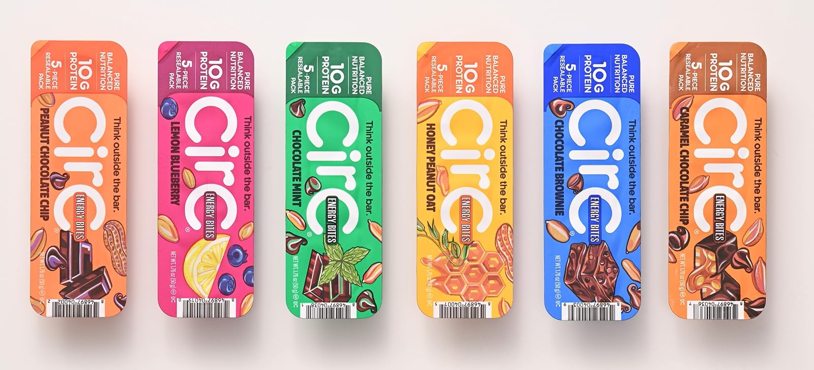 CirC Portable Energy Bites are a reimagined take on traditional protein bars, offering five perfectly portioned energy bites that blend convenience, taste, and nutrition into one satisfying snack. Designed for an active lifestyle, these better-for-you goodies are ideal for on-the-go, at work, or post-workout, providing a harmonious blend of flavors and textures made from simple, natural ingredients like whole grain oats, peanuts, dates, and sustainable whey crisp. Packaged in a resealable, eco-conscious tray, these gluten-free snacks offer flexible snacking on the go for athletes and ordinary people of all ages–adults, teens, and kids. Real Food Flavor Texture Available in a variety of delicious flavors—Mint Chocolate Chip, Caramel Chocolate Chip, Lemon Blueberry, Honey Peanut Oat, Peanut Chocolate Chip, and Chocolate Brownie—CirC bites strike the perfect balance between chewiness, sweetness, and nutritional value, making them suitable for any activity level or age group. With a commitment to quality, CirC bites are free fromgluten, preservatives, and artificial sweeteners, ensuring a clean and nourishing snack. Portable Protein Snack Packs The transparent, resealable packaging allows you to keep these energy bites fresh and sample whenever you need a boost of energy. Each pack showcases the natural ingredients inside, with no artificial flavors or off-putting aftertastes, just a soft, balanced, homemade flavor that's perfect fuel to power your day, whether for sports, travel, dessert, breakfast, or snacking. CirC Portable Energy Bites are compact, convenient, and designed with sustainability in mind, making them a smart and delicious choice for fueling your day.SEE WHAT YOU GET: Our transparent, recyclable tray lets you see the simple, natural ingredients inside each energy ball. No artificial flavors or weird tastes—just a soft, balanced, homemade taste and natural texture to enjoy in every bite. QUALITY INGREDIENTS: CirC energy bites are made with a balanced blend of whole grain oats, peanuts, dates, cassava, and agave for a sweet delicious flavor with less sugar. CirC protein snacks for kids and adults are free from gluten, preservatives, and artificial sweeteners, offering clean and efficient protein. FLEXIBLE SNACKING: CirC energy bites come in a resealable tray, allowing you to snack at your own pace while keeping the tasty protein balls fresh. These gluten-free and non-GMO bite-size treats combine portability with the great taste and soft bite of homemade snacks. PORTABLE ENERGY BITES: CirC reimagined the protein bar as 5 snackable energy bites, perfect for on-the-go, at work, or post-workout. Made with simple, natural ingredients like peanuts, oats, dates, and sustainable whey crisp, each high protein energy ball offers a well-balanced, homemade taste. NEW VARIETY 12 PACK: Indulge your taste buds while increg your daily protein intake with 12 packages of 5 bite-sized energy bites. The Variety Pack contains 2 of each flavor: Peanut Chocolate Chip, Honey Oat, Chocolate Brownie, Lemon Blueberry, Carmel Chocolate Chip, and Mint Chocolate Chip energy bites. Each 5-bite pack is made with 10g of whey protein and packed with whole grains, nuts and fruits. These protein balls will give you the energy and nutrition to tackle any activity.