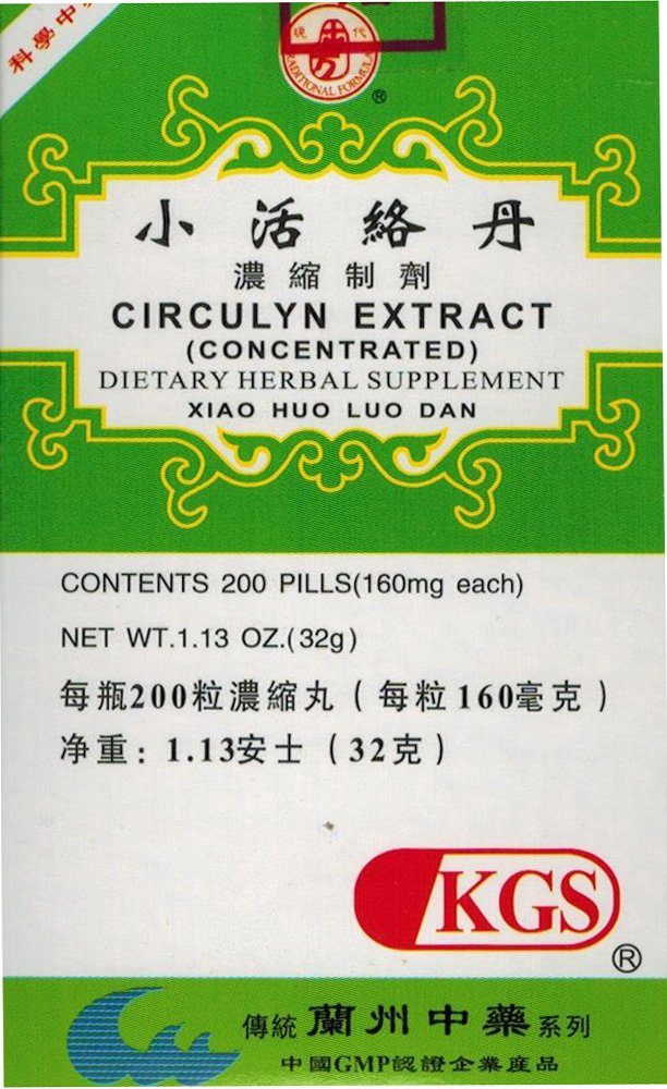 Circulyn Extract (Xiao Huo Luo Dan). Packing: 200 concentrated pills (160mg each) bottle. Manufactured by Lanzhou Traditional Herbs, China. This is a patent remedy based on the ancient recipe "Xiao Huo Luo Dan" (Mild Pill for Activating Meridians) in TCM originally appeared in Tai Ping Hui Min He Ji Ju Fang (Benevolent Prescriptions from Taiping Pharmaceutical Bureau), which is primarily used for expelling wind and activating collaterals, removing dampness and alleviating pain, in cases of wind-cold-dampness arthralgia, pain of limbs, numbness and muscular contracture.
