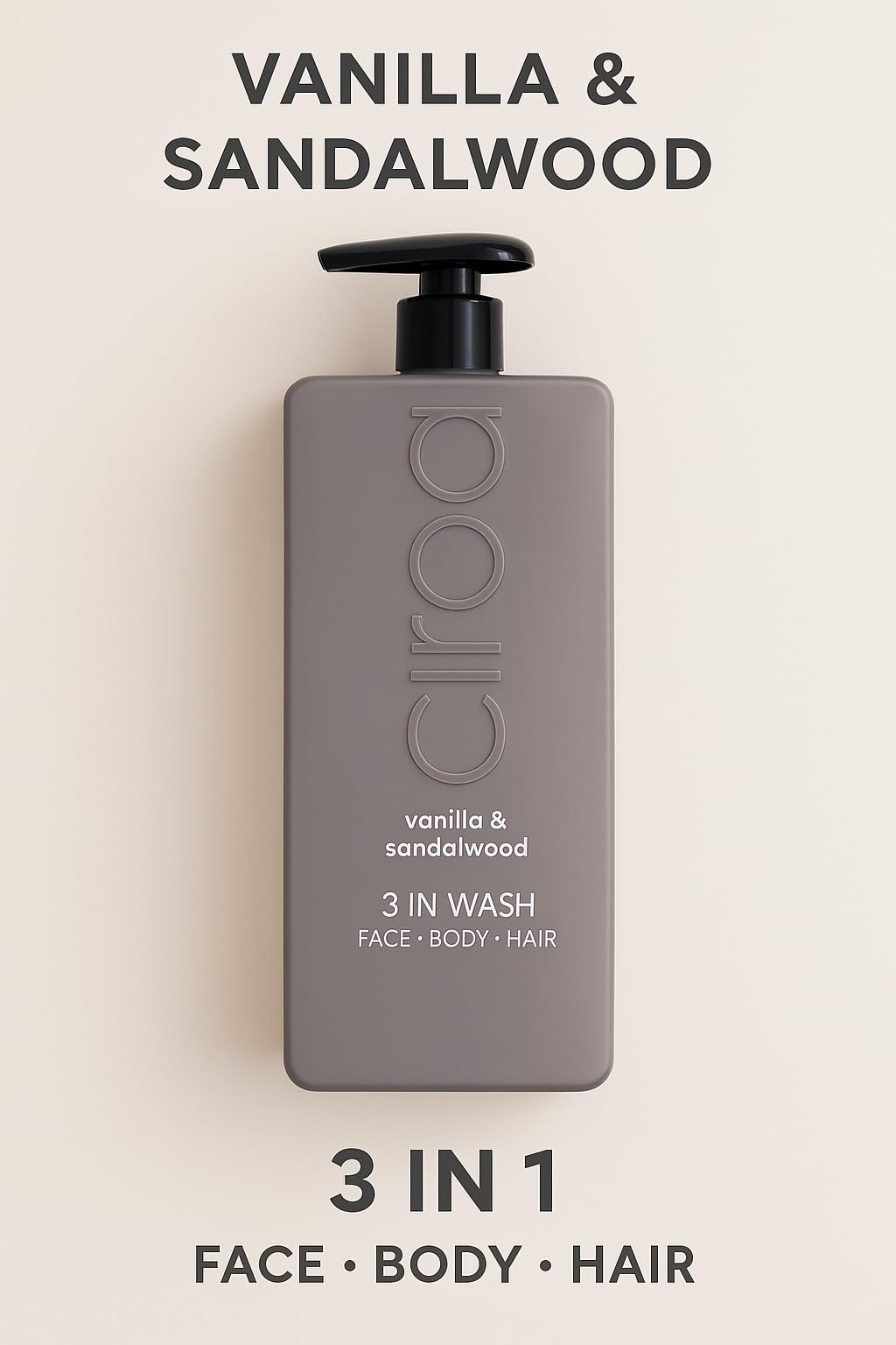 Ciroa, 3 in 1 Wash, Face-Body-Hair, Vanilla Sandalwood, 33.8 fl oz (1,000ml) Pack of One, A body, hair and face wash scented with grounding Vanilla Sandalwood.