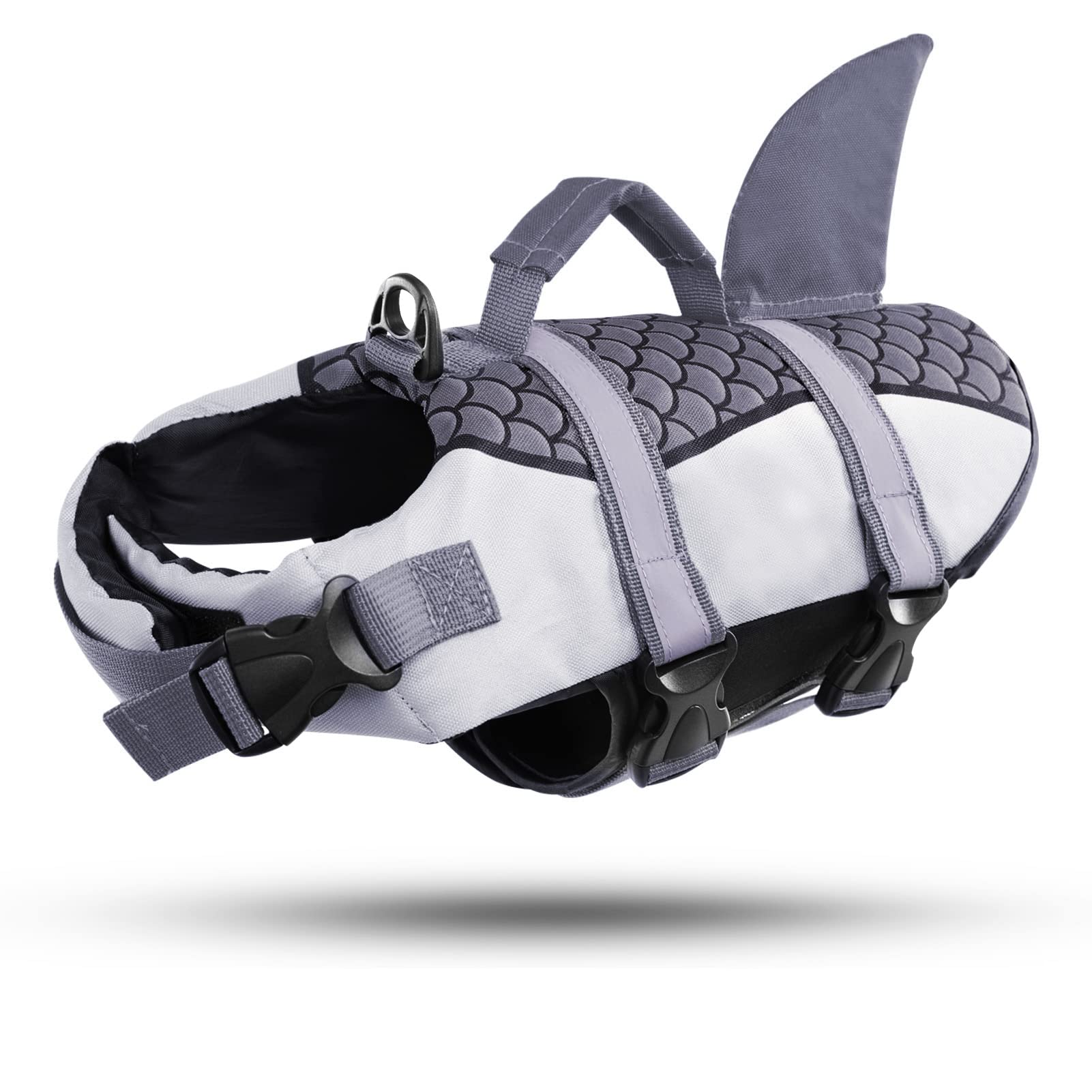 Comfortable and safeThese life jackets for small and medium-sized dogs are equipped with fluffy neck and belly bands, three adjustable straps ensure a tight-fitting and comfortable fit for puppies.Handle and useful D-ringThe dog swimming vest is equipped with a handle with which you can lead your dog to swim for the first time or get it out of the water quickly and easily in an emergency If you want to go for a walk on the beach and avoid the dog going away, you can conveniently and safely attach a leash to the D-ring.Reflective and fashionableA series of shiny fish scales and funny shark fins are added to the swimming aid, how beautiful!The attached reflex strips improve visibility so that you can recognize your pet in the water.Ripstop fabric and good buoyancyOber fabric consists of 600d oxford ripstop, ripstop and drying quickly The floatable foam filling from EVE offers the buoyancy that your furry friend needs If you have fun in the water with your dog, this life jacket protects him.Pay attention to the sizeDog parents, please remember to measure the chest, the neck circumference and the back length of your dog before selecting a size.Please do not select the size according to the weight of the dog.If your dog is between the two sizes, please choose a larger size.Bequem und sicherDiese Schwimmwesten für kleine und mittelgroße Hunde sind mit flauschigen Hals- und Bauchbändern ausgestattet, drei verstellbare Träger sorgen für eine eng anliegende und bequeme Passform für Welpen. Griff und nützlicher D-RingDie Hundeschwimmweste ist mit einem Griff ausgestattet, mit dem Sie Ihren Hund beim ersten Schwimmen führen oder ihn im Notfall schnell und einfach aus dem Wasser holen können Wenn Sie am Strand spazieren gehen und vermeiden möchten, dass der Hund wegläuft, können Sie bequem und sicher eine Leine am D-Ring befestigen. Reflektierend und modischEine Reihe von glänzenden Fischschuppen und lustigen Haifischflossen werden der Schwimmhilfe hinzugefügt, wie schön! Die angebrachten Reflexstreifen verbessern die Sichtbarkeit, sodass Sie Ihr Haustier im Wasser erkennen können. Ripstop-Gewebe und guter AuftriebOberstoff besteht aus 600D Oxford Ripstop, Ripstop und schnell trocknend Die schwimmfähige Schaumstofffüllung von EVE bietet den Auftrieb, den Ihr pelziger Freund braucht Wenn Sie mit Ihrem Hund Spaß im Wasser haben, schützt diese Schwimmweste ihn. Achten Sie auf die GrößeHundeeltern, bitte denken Sie daran, den Brustumfang, den Halsumfang und die Rückenlänge Ihres Hundes zu messen, bevor Sie eine Größe auswählen. Bitte wählen Sie die Größe nicht nach dem Gewicht des Hundes. Wenn Ihr Hund zwischen den beiden Größen liegt, wählen Sie bitte eine größere Größe.CITÉTOILE Hundeschwimmweste Hai mit Griff und Reflektierend, Schwimmweste für Kleine Mittlere und Große Hunde, Dog Life Jacket Schützen Sie Hunde beim Schwimmen im Meer See Fluss, Grau, L L grau