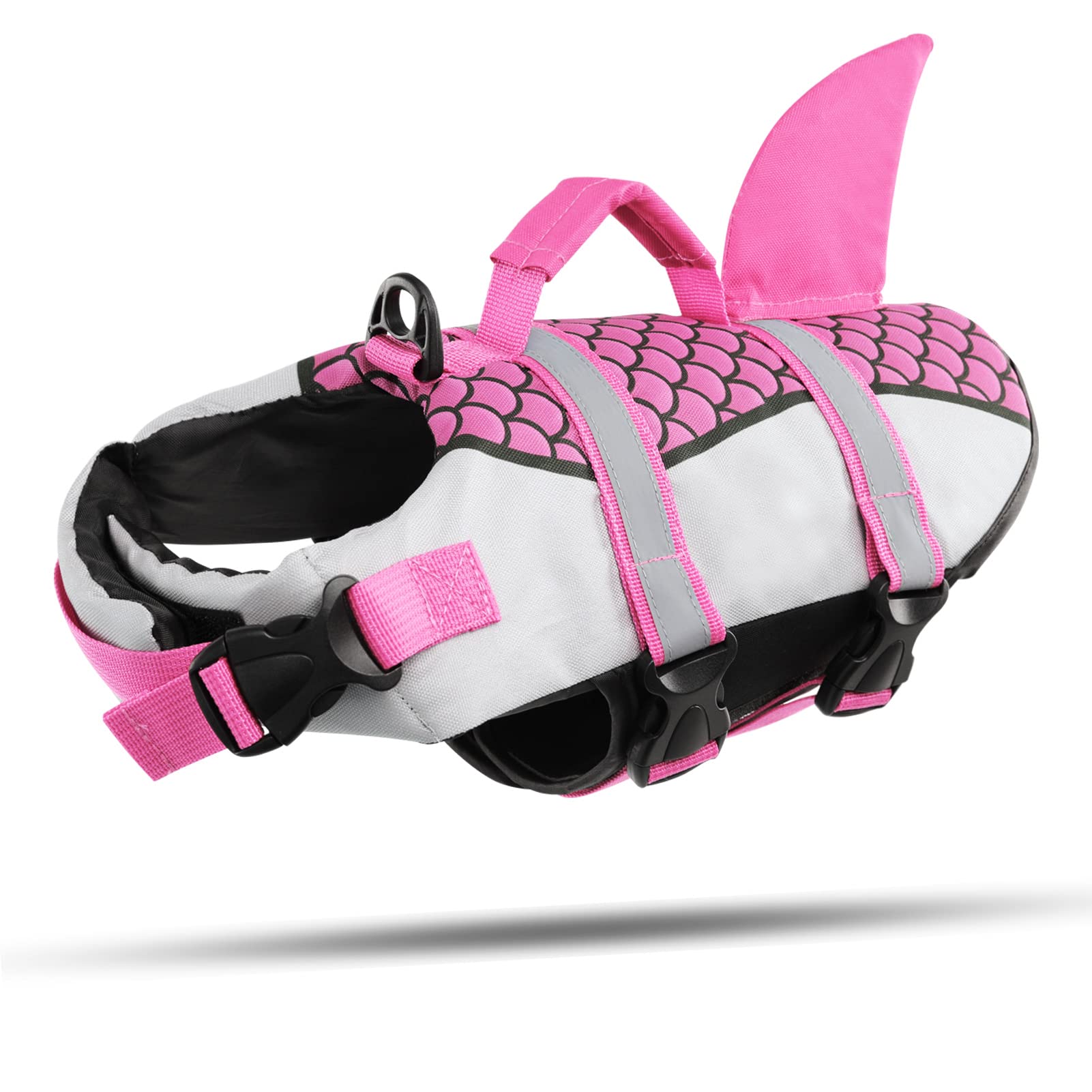 Comfortable and safeThese life jackets for small and medium-sized dogs are equipped with fluffy neck and belly bands, three adjustable straps ensure a tight-fitting and comfortable fit for puppies.Handle and useful D-ringThe dog swimming vest is equipped with a handle with which you can lead your dog to swim for the first time or get it out of the water quickly and easily in an emergency If you want to go for a walk on the beach and avoid the dog going away, you can conveniently and safely attach a leash to the D-ring.Reflective and fashionableA series of shiny fish scales and funny shark fins are added to the swimming aid, how beautiful!The attached reflex strips improve visibility so that you can recognize your pet in the water.Ripstop fabric and good buoyancyOber fabric consists of 600d oxford ripstop, ripstop and drying quickly The floatable foam filling from EVE offers the buoyancy that your furry friend needs If you have fun in the water with your dog, this life jacket protects him.Pay attention to the sizeDog parents, please remember to measure the chest, the neck circumference and the back length of your dog before selecting a size.Please do not select the size according to the weight of the dog.If your dog is between the two sizes, please choose a larger size.Bequem und sicherDiese Schwimmwesten für kleine und mittelgroße Hunde sind mit flauschigen Hals- und Bauchbändern ausgestattet, drei verstellbare Träger sorgen für eine eng anliegende und bequeme Passform für Welpen. Griff und nützlicher D-RingDie Hundeschwimmweste ist mit einem Griff ausgestattet, mit dem Sie Ihren Hund beim ersten Schwimmen führen oder ihn im Notfall schnell und einfach aus dem Wasser holen können Wenn Sie am Strand spazieren gehen und vermeiden möchten, dass der Hund wegläuft, können Sie bequem und sicher eine Leine am D-Ring befestigen. Reflektierend und modischEine Reihe von glänzenden Fischschuppen und lustigen Haifischflossen werden der Schwimmhilfe hinzugefügt, wie schön! Die angebrachten Reflexstreifen verbessern die Sichtbarkeit, sodass Sie Ihr Haustier im Wasser erkennen können. Ripstop-Gewebe und guter AuftriebOberstoff besteht aus 600D Oxford Ripstop, Ripstop und schnell trocknend Die schwimmfähige Schaumstofffüllung von EVE bietet den Auftrieb, den Ihr pelziger Freund braucht Wenn Sie mit Ihrem Hund Spaß im Wasser haben, schützt diese Schwimmweste ihn. Achten Sie auf die GrößeHundeeltern, bitte denken Sie daran, den Brustumfang, den Halsumfang und die Rückenlänge Ihres Hundes zu messen, bevor Sie eine Größe auswählen. Bitte wählen Sie die Größe nicht nach dem Gewicht des Hundes. Wenn Ihr Hund zwischen den beiden Größen liegt, wählen Sie bitte eine größere Größe.CITÉTOILE Hundeschwimmweste Hai mit Griff und Reflektierend, Schwimmweste für Kleine Mittlere und Große Hunde, Dog Life Jacket Schützen Sie Hunde beim Schwimmen im Meer See Fluss, Rosa, XS XS Rosa