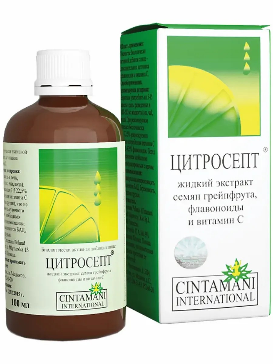 Капли Цитросепт - это вытяжка из семени грейпфрута вместе с экстрактом биофлаваноидов. Он угнетает вирусы в организме человека, а так же повышает иммунитет. Используется при различных золеваниях, гриппе, воспалениях слизистых оболочек, в гинекологии. Так же эффективен для похудения. Можно употреблять как детям так и взрослым. Внутри коробки вы найдете подробную инструкцию по применению препарата Цитросепт. Капли грейпфрута для внутреннего и наружного применения Цитросепт. Это экстракт биофлаваноидов семян грейпфрута (33%) и витамина С (т.н. Комплекс витамина С)Основная ценность этого продукта состоит в том, что он обладает очень высокой биодоступностью, благодаря высочайшему содержанию биофлаваноидов и особенностям технологии производства, он оказывает положительное влияние на очень большой спектр заболеваний.Цитросепт является очень мощным иммуномодулятором.Различные виды гриппа и другие ОРВИ.Парагрипп.Ангина.Женские, дрожжевые инфекции.Варикозное расширение вен и трофические язвы.Герпес.Грибки кожи и слизистых, грибки на ногтях.Угревая сыпь, дерматиты, красный и плоский лишай.Папилломы, кондиломы, бородавки на коже.Состав-исключительно растительные компоненты. 100 мл препарата в жидкой форме содержат гликозиды, 19,37 г биофлавоноидов и 4,9 г витамина С.