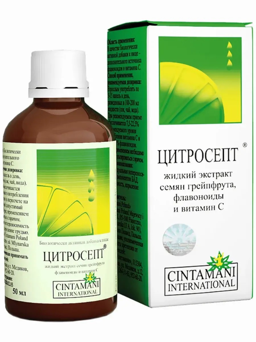 Капли Цитросепт - это вытяжка из семени грейпфрута вместе с экстрактом биофлаваноидов. Он угнетает вирусы в организме человека, а так же повышает иммунитет. Используется при различных золеваниях, гриппе, воспалениях слизистых оболочек, в гинекологии. Так же эффективен для похудения. Можно употреблять как детям так и взрослым. Внутри коробки вы найдете подробную инструкцию по применению препарата Цитросепт. Капли грейпфрута для внутреннего и наружного применения Цитросепт. Это экстракт биофлаваноидов семян грейпфрута (33%) и витамина С (т.н. Комплекс витамина С)Основная ценность этого продукта состоит в том, что он обладает очень высокой биодоступностью, благодаря высочайшему содержанию биофлаваноидов и особенностям технологии производства, он оказывает положительное влияние на очень большой спектр заболеваний.Цитросепт является очень мощным иммуномодулятором.Различные виды гриппа и другие ОРВИ.Парагрипп.Ангина.Женские, дрожжевые инфекции.Варикозное расширение вен и трофические язвы.Герпес.Грибки кожи и слизистых, грибки на ногтях.Угревая сыпь, дерматиты, красный и плоский лишай.Папилломы, кондиломы, бородавки на коже.Состав-исключительно растительные компоненты. 100 мл препарата в жидкой форме содержат гликозиды, 19,37 г биофлавоноидов и 4,9 г витамина С.