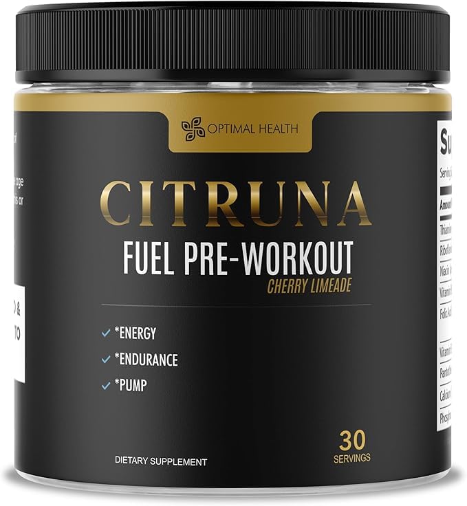 MADE IN THE USA: All Citruna supplements are formulated right here in the USA, where we work closely with our manufacturers to ensure every product is safe and effective. At Optimal Health, we take pride in our transparency and commitment to providing high-quality, affordable supplements you can trust. EVERYDAY BENEFITS: Whether you're lifting weights at the gym or taking a stroll through the city, Citruna Fuel delivers the energy, endurance, and focus you need whenever you need a boost. It helps support muscle strength, enhances circulation, and increases overall stamina, making it your go-to supplement for everyday activities. FOCUS MATRIX: This powerful energy supplement is formulated with a thoughtfully selected matrix of amino acids, vitamins, and natural stimulants like caffeine to boost energy levels, enhance circulation, and sharpen mental focus. Key ingredients such as L-Citrulline, L-Arginine, and Vitamin B12 are included to ensure you get the most out of every workout and maintain optimal cognitive performance. ENERGY-BOOSTING VITAMINS: Our expertly crafted blend of B-complex vitamins lays a powerful foundation for converting carbohydrates into fuel, providing you with sustained energy throughout your day. Key B-vitamins such as thiamine, riboflavin, and niacin work in harmony to metabolize fats and proteins, ensuring that your body efficiently utilizes the nutrients from your food for maximum energy output. FUEL YOUR WORKOUT: Elevate your workout with Citruna Fuel Preworkout Mix, expertly crafted to provide the energy and nutrients you need to conquer your exercise goals. Designed to fuel your active lifestyle, Citruna Fuel Pre Workout Mix delivers the support essential for peak performance and endurance. Whether you're powering through a tough session or aiming to surpass your personal best, Citruna Fuel ensures you're ready to take on any challenge.