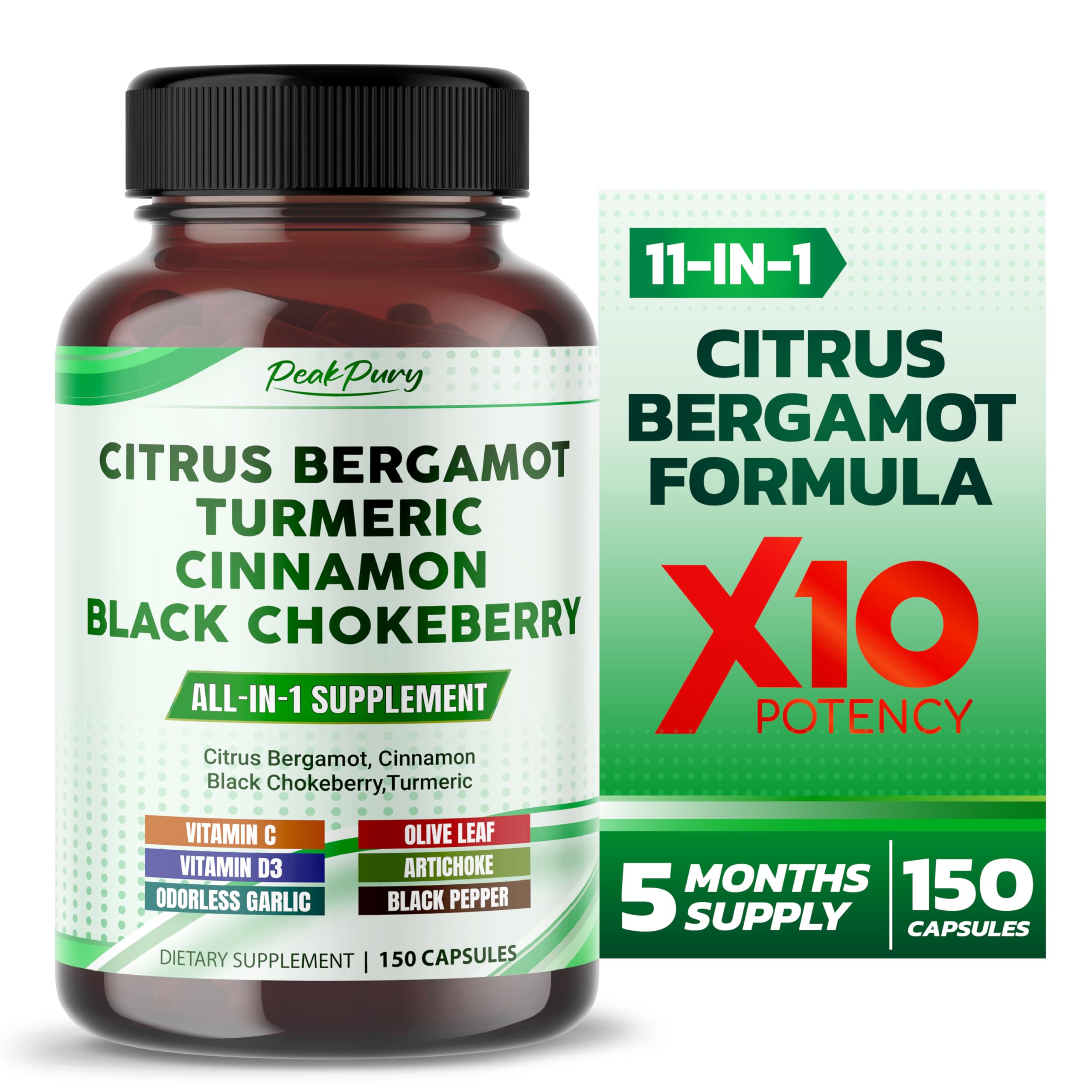 Top-notch Quality: Made with premium ingredients in a cGMP-compliant facility, this product undergoes rigorous third-party labs testing to ensure ingredient quality. 100 Natural: Each ingredient in PeakPury is meticulously selected from trusted sources, ensuring they're all entirely natural, non-GMO, gluten-free, sugar-free, and free from chemicals. Citrus Bergamot contains 11 potent herbs: Vitamin C, Vitamin D3, Niacin, Citrus Bergamot, Cinnamon, Black Chokeberry, Turmeric, Odorless Garlic, Olive Leaf, Artichoke, and Black Pepper. All-inclusive Supplement: The Citrus Bergamot capsule support circulatory wellness, promotes overall well-being, and supports the immune system. Powerful Blend: PeakPury Citrus Bergamot Capsules provide a premium, high-potency formula in every serving. With 150 capsules per bottle, it provides an optimal 5-month dosage supply.