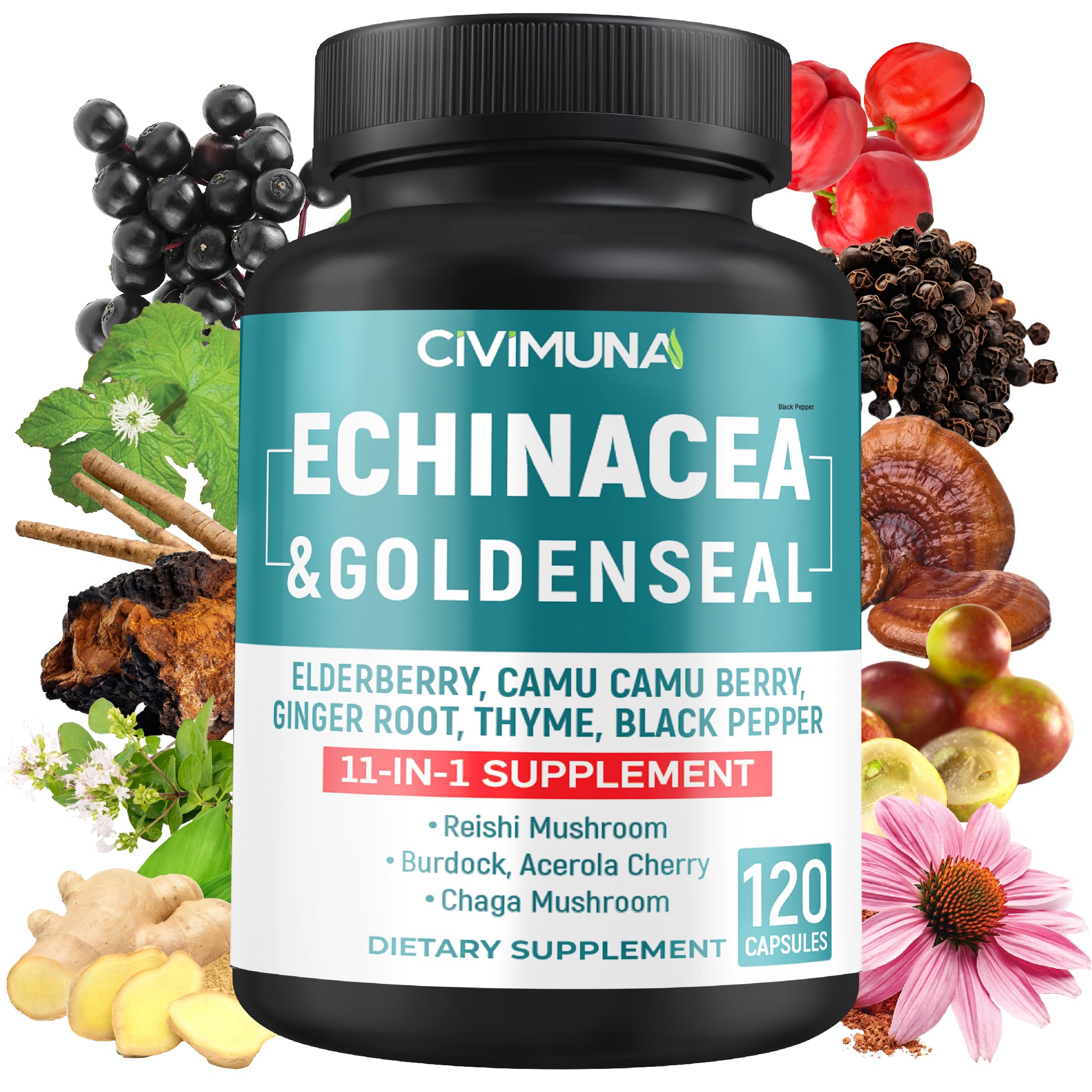 120 Capsules (Pack of 1). With this bottle of Echinacea supplements, you get 4 Months of supply in just one purchase. Ingredients: Echinacea, Goldenseal Root, Elderberry, Camu Camu Berry, Ginger Root, Thyme Herbs, Chaga Mushroom, Reishi Mushroom, Burdock, Acerola Cherry, and Black Peper.