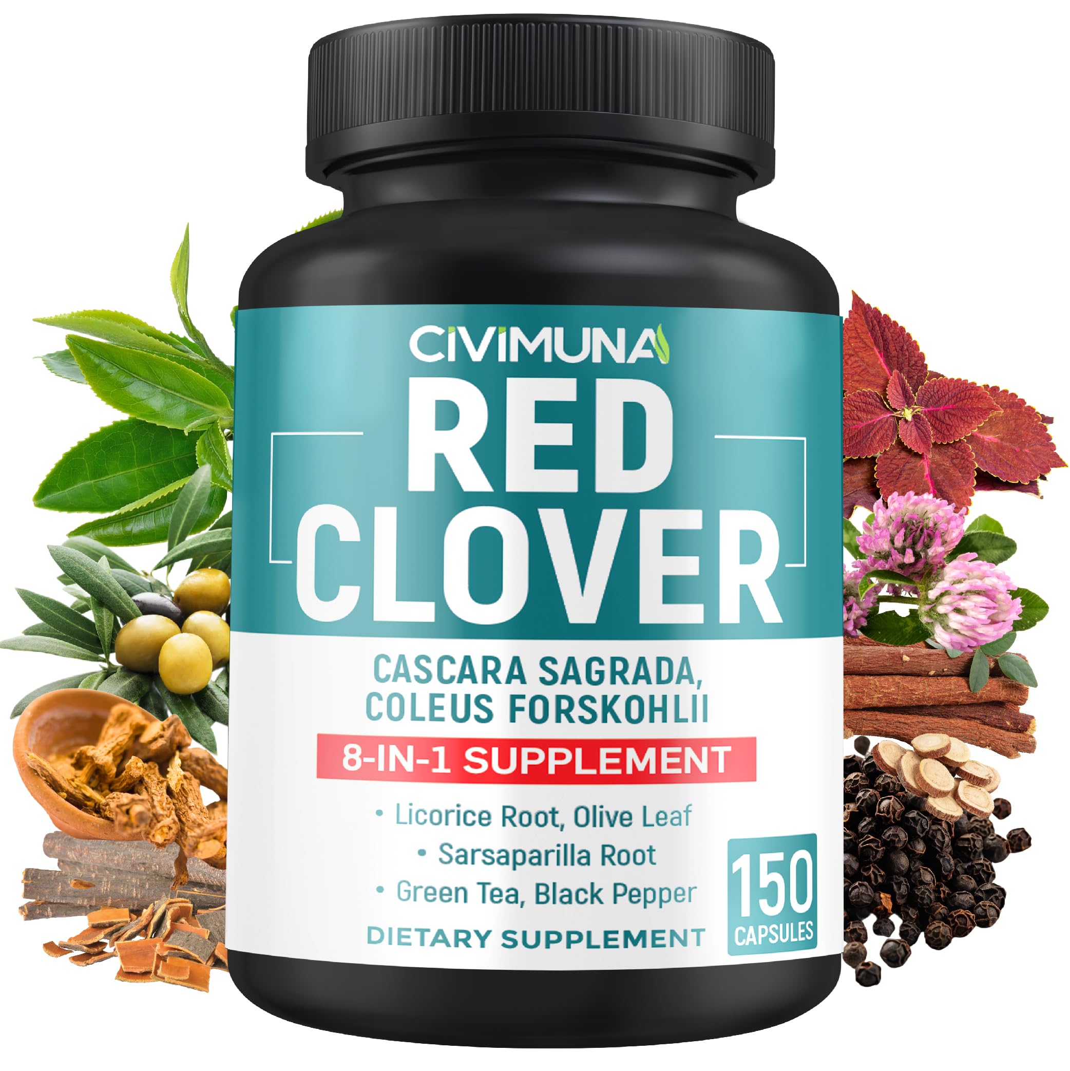 150 Capsules (pack of 1). With this bottle of Red Clover supplements, you get 5 Months of supply in just one purchase. Ingredients: Red Clover, Cascara Sagrada Bark, Coleus Forskohlii, Licorice Root, Olive Leaf, Sarsaparilla Root, Green Tea Leaf, and Black Peper.