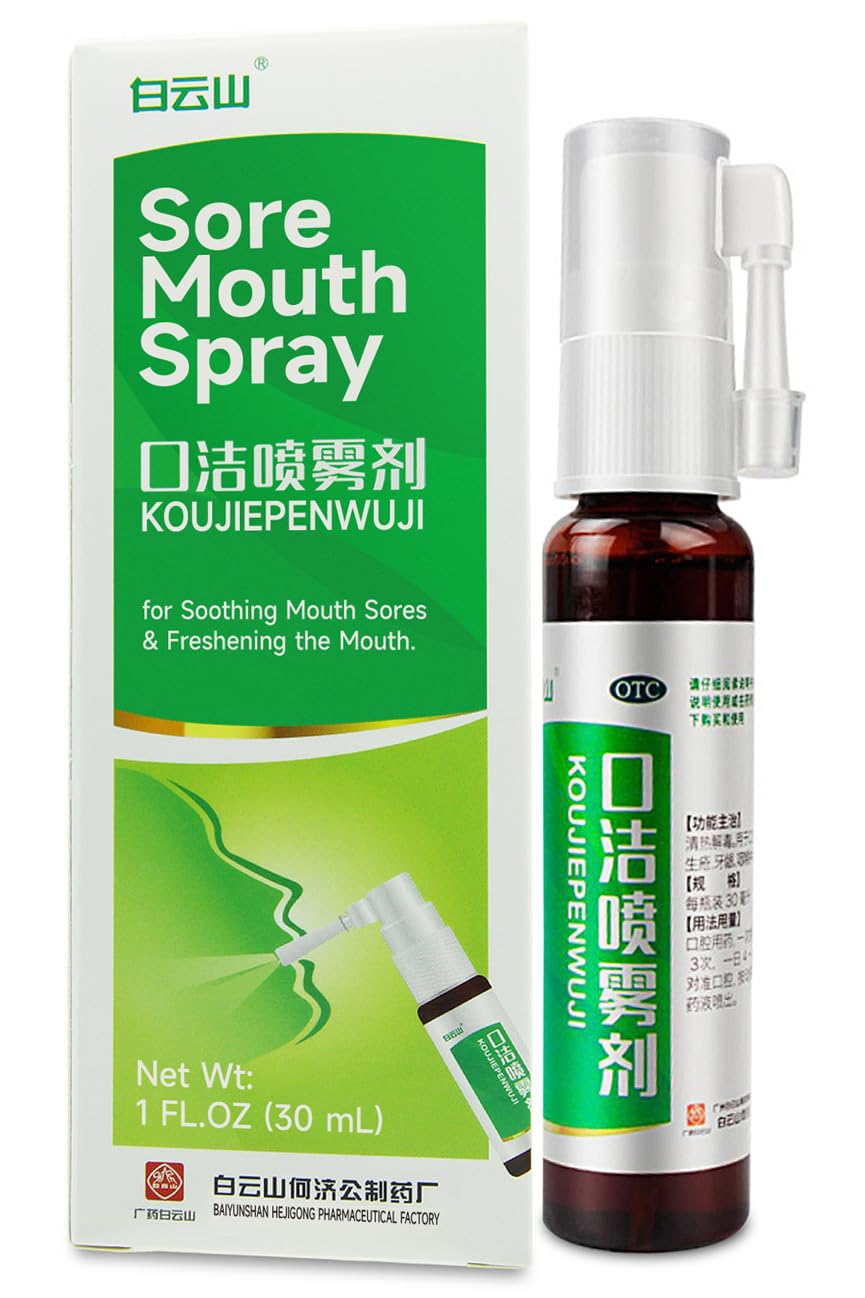 The product for soothing mouth sores and freshening the mouth. Baiyunshan Kou Jie Pen Wu Ji (Sore Mouth Spray) is the ideal mouth ulcer spray. It has a variety of herbal ingredients, such as wild honeysuckle flower (Shan Yin Hua), Chrysanthemum (Ju Hua), isatis root (Ban Lan Gen), Mint (Bo He Nao) Eucalyptus (An You), which act as a heat-clearing and detox agent together with other ingredients, such as Potassium Citrate, it provides the strongest protection for oral health. Directions: Press 2 to 3 times at a time, 4 to 6 times a day aim the bottle at the mouth and press the cap to make the solution spray out. When using this product: avoid contact with the eyes