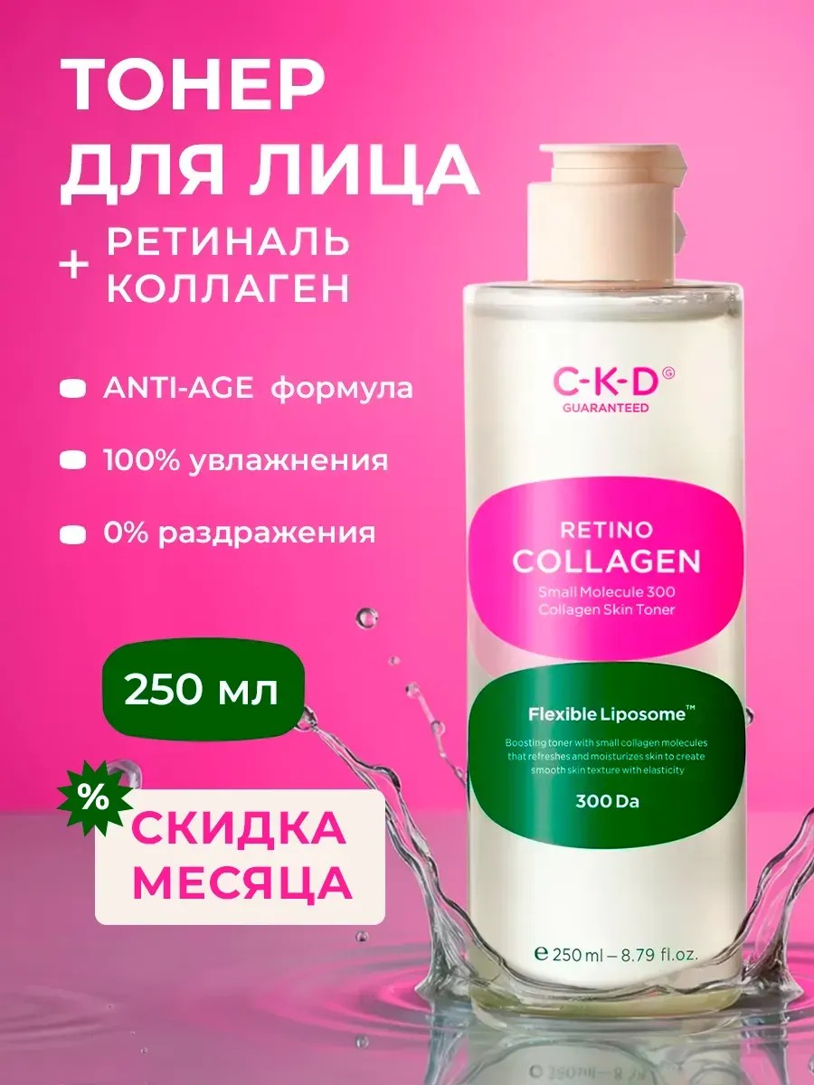 Укрепляющий липосомный тоник с ретиналем и коллагеном CKD Retino Collagen Small Molecule 300 Collagen Skin Toner стимулирует процессы обновления, интенсивно увлажняет, избавляет от сухости после умывания и готовит кожу последующим этапам ухода.