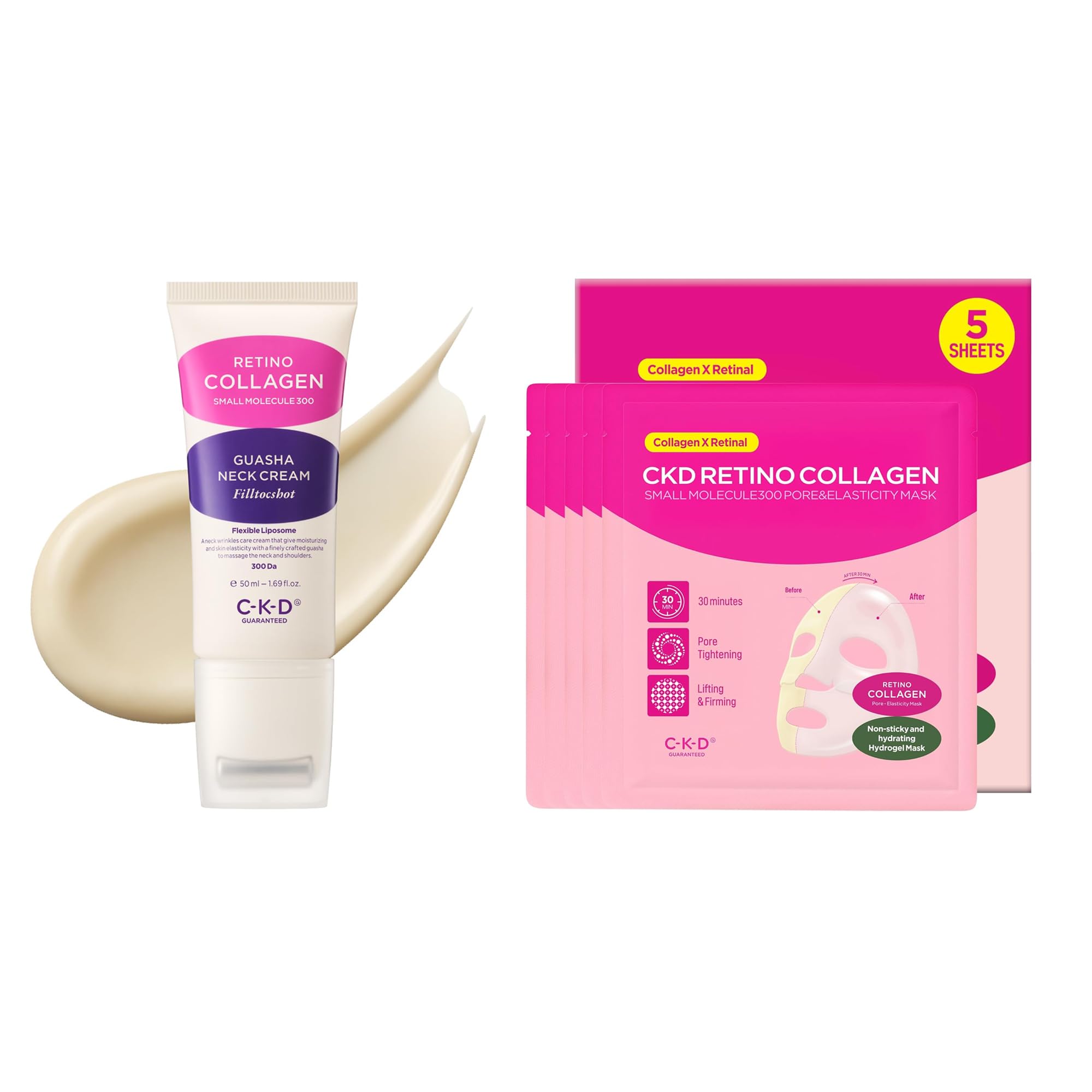 KOREAN ROOTS WITH PHARMACEUTICAL EXPERTISE: Developed by Chung Kun Dang, a trusted name in the pharmaceutical industry in South Korea, CKD beauty products leverage advanced scientific research and high-quality ingredients to ensure optimal efficacy and safety for your skin. Experience the difference of skincare grounded in medical innovation. HYDRATION, FIRMNESS GLOW: Clinically proven neck cream increases hydration by 197.7 after one use, while masks deliver deep moisturizing, calming, and brightening care with panthenol and niacinamide—leaving skin hydrated, firm, and luminous. NECK LIFTING FACIAL REFINEMENT: The award-winning neck cream with guasha roller enhances absorption 3–4x while visibly lifting the neck, jawline, and décolleté. The hydrogel masks refine pores, smooth texture, and boost radiance in just 30 minutes. RETINAL COLLAGEN POWER DUO: Both formulas feature 2x retinal (400ppm) and 300-dalton low-molecular collagen to deeply penetrate, stimulate collagen production, improve elasticity, and reduce fine lines and wrinkles. COMPLETE ANTI-AGING CARE SET: Bundle includes CKD Gua Sha Neck Cream with massage roller plus 5 Retino Collagen Hydrogel Face Masks—targeting wrinkles, sagging skin, and dullness for firmer, smoother, more youthful-looking skin.