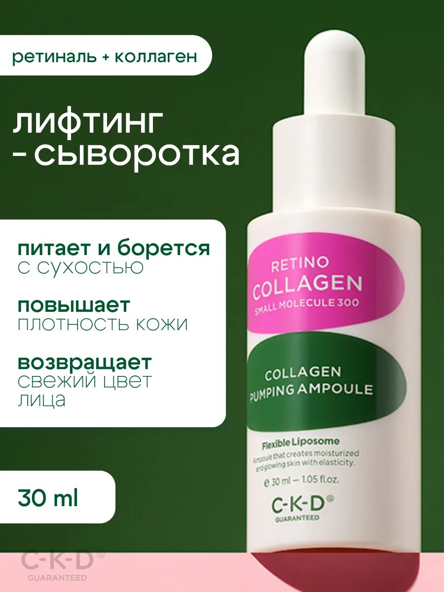 Anti-aging liposomal lifting ampoule with retinal, CKD Retino Collagen Small Molecule 300 Pumping Ampoule (30 ml), has a pronounced firming effect, increases skin density, and protects against thinning.