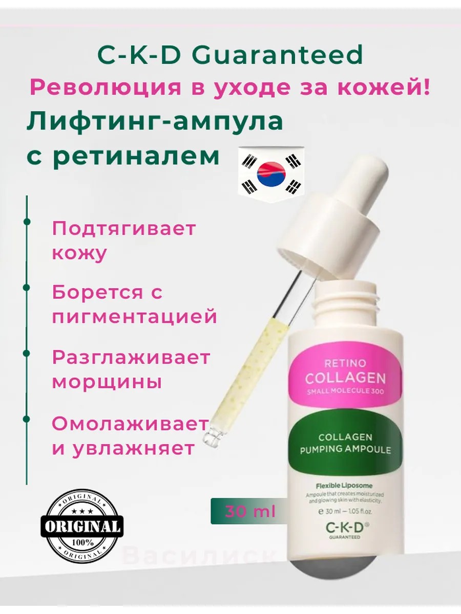 CKD Retina Collagen Липосомальная сыворотка с ретинолом и пептидами для лица. CKD Retino Collagen Small Molecule 300 Pumping Ampoule это инновационная липосомальная сыворотка для лица с ретиналем, разработанная для интенсивного лифтинга и антивозрастного ухода. Формула на основе стабилизированного ретиналя (одной из самых эффективных форм витамина А) и пептидов способствует глубокому обновлению кожи, разглаживанию морщин и повышению плотности эпидермиса.