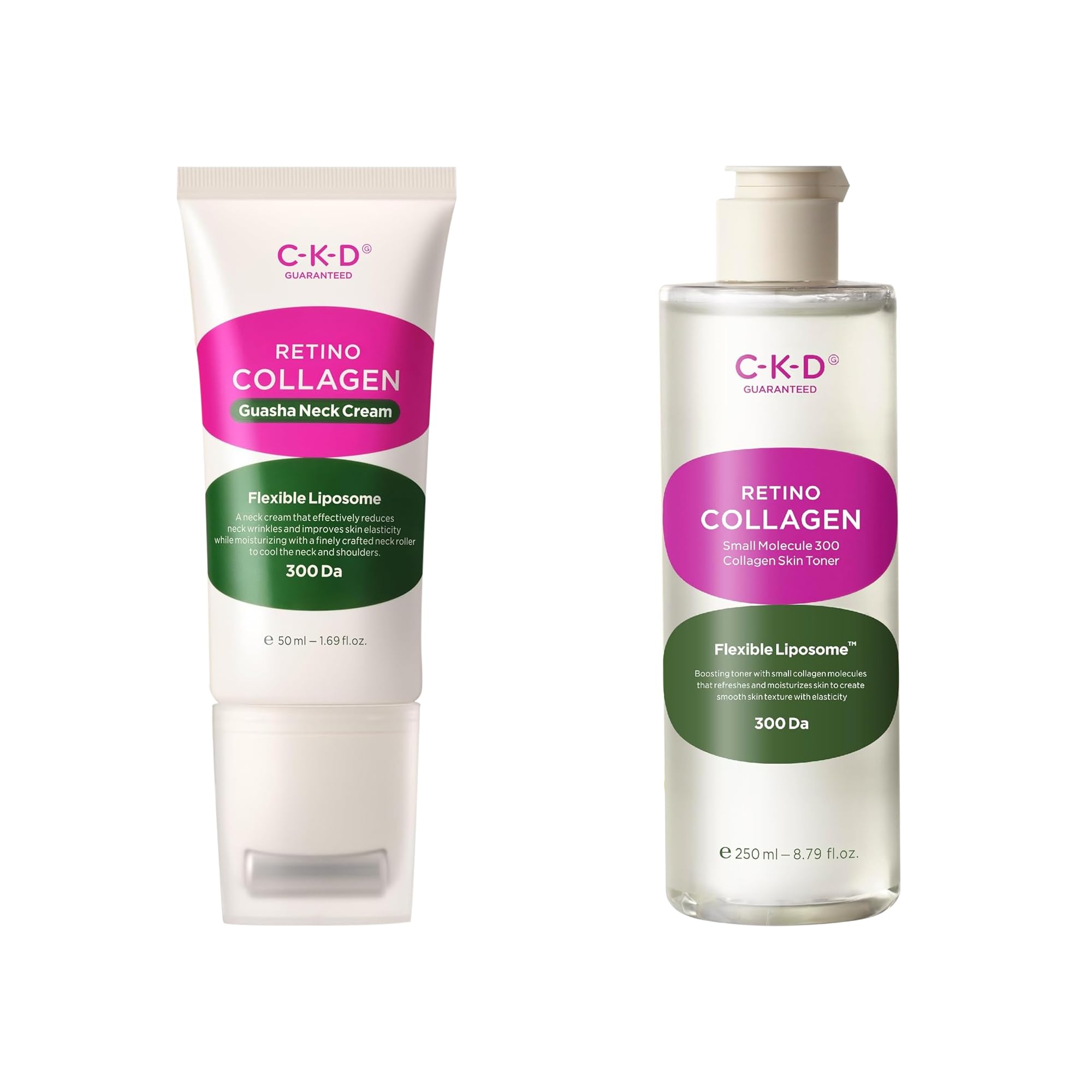 KOREAN SKINCARE BACKED BY PHARMACEUTICAL EXPERTISE Created by CKD (Chung Kun Dang), a leader in Korean pharmaceutical skincare, these formulas blend innovation with gentle care, making them ideal for sensitive skin while delivering professional-grade anti-aging results. ? POWERFUL WRINKLE SAGGING REDUCTION Both products stimulate collagen production and accelerate cell regeneration to visibly reduce fine lines, deep wrinkles, and sagging skin. Experience smoother, firmer skin with consistent use, targeting common aging areas. INTENSIVE NECK FIRMING WITH MASSAGE TOOL The neck cream's advanced formula delivers low-molecular collagen and retinol deeply to lift, tighten, and nourish the neck, jawline, and décolleté. Use the included Gua Sha roller to enhance absorption and promote circulation for a visible lift. DEEP HYDRATION SKIN TEXTURE REFINEMENT The lightweight, water-based toner hydrates sensitive and dry skin with 300 Dalton collagen and hyaluronic acid. It tightens pores and smooths uneven texture, prepping skin for enhanced absorption of your entire skincare routine. COMPLETE ANTI-AGING SKINCARE DUO This bundle pairs CKD's gentle Retino Collagen Skin Toner with the firming Retinol Collagen Neck Cream and Gua Sha roller for a full targeted approach to youthful skin. Together, they reduce wrinkles, improve elasticity, and boost collagen production from face to neck.