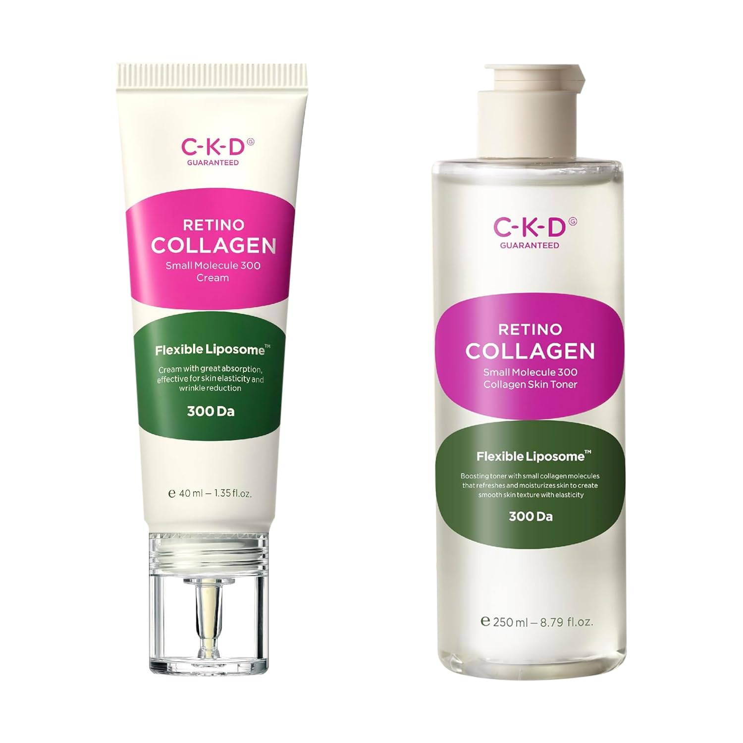 Lightweight, Fast-Absorbing Formulas: Both products are designed for daily use, featuring flexible liposome technology and water-based textures that absorb quickly without stickiness, leaving skin soft, smooth, and youthful. Multi-Targeted Firming Texture Refinement: The cream targets elasticity on forehead, cheeks, chin, eyes, and lips while the toner tightens pores, refines texture, and preps skin for better absorption of skincare products. Deep Hydration Barrier Repair: Hyaluronic acid and elastin-rich formulas deeply hydrate, restore moisture balance, and strengthen the skin barrier for a plump, radiant complexion—perfect for dry and sensitive skin. Advanced Collagen Technology: Features 300 Dalton low-molecular-weight collagen and stabilized retinal (third-generation Retinal) for superior skin absorption and collagen synthesis, improving skin density and smoothness. Complete Anti-Aging Duo: Combines CKD Retino Collagen Face Cream and Skin Toner to deliver powerful wrinkle reduction, skin firming, and elasticity enhancement in a synergistic Korean skincare routine.