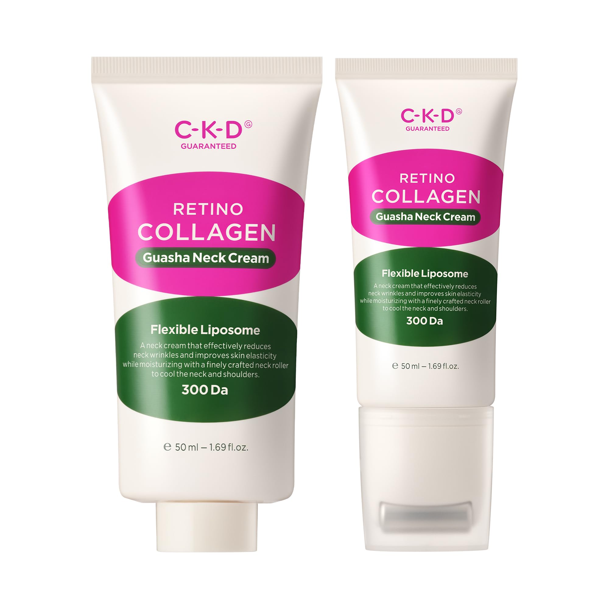 Targeted Korean Skincare Innovation: Dermatologically tested and designed for delicate neck skin, this fragrance-free, fast-absorbing cream visibly reduces the look of fine lines, sagging, and crepey skin with consistent use. Stainless Steel Massage Roller for Sculpting: The built-in Gua Sha roller helps lift and contour the neck and jawline while enhancing cream absorption, improving circulation, and reducing puffiness—turning your routine into a spa-like treatment. Deep Hydration Skin Renewal: Hyaluronic acid and amino acids deliver long-lasting hydration while elastin and retinol boost skin regeneration—improving texture, tone, and resilience with every application. Clinically Inspired Collagen Retinol Formula: Infused with 300-dalton low-molecular collagen and gentle yet effective retinal, this cream visibly lifts sagging skin, smooths deep wrinkles, and enhances elasticity for a more sculpted, youthful neckline. Complete Neck Jawline Firming Set: This 2-piece bundle includes the CKD Gua Sha Neck Cream with stainless steel massage roller and a full-size refill (1.69 fl oz each), offering a full anti-aging solution to firm, tighten, and hydrate the neck and jawline.