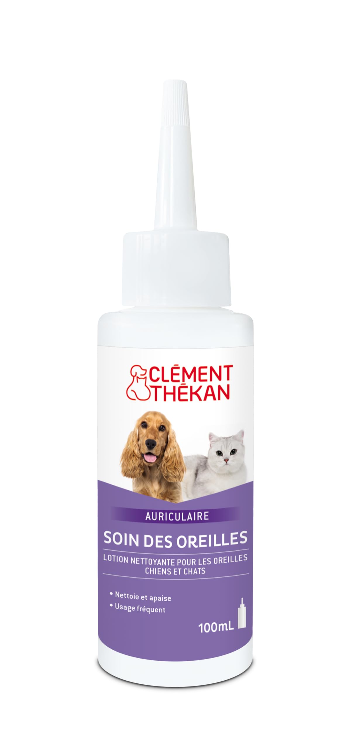 CLÉMENT THÉKAN - EAR CARE Ear Care is a cleaning lotion for the ears of dogs and cats. Cleans and soothes. Suitable for frequent use: once a week for animals with lop-eared ears, and every 15 days for animals with erect ears. 100 mL bottle DIRECTIONS FOR USE DIRECTIONS FOR USE: Gently insert the tip of the bottle into the entrance to the ear canal and place 2 drops there. Gently massage the base of the ear. Allow your pet to shake its head, this will allow better penetration of the product and will bring dirt up to the entrance to the ear canal. Then wipe off the excess lotion and removed impurities with a compress. PRECAUTIONS FOR USE: Wash hands after handling. Ear lotion for animals. Do not swallow or swallow. Do not use on a sick, convalescent animal or animal less than 3 months old. Do not apply to eyes. In case of contact with eyes, wash with plenty of water. Store at room temperature away from light and heat. Harmful to aquatic organisms, causes long-term adverse effects. Keep out of reach of children. Dispose of contents container to a collection point.EASY TO USE. FREQUENT USE: Clément Thékan Ear Care can be used as a maintenance cleaning once a week for animals with floppy ears, and every 15 days for animals with erect ears. DISSOLVES EARWAX FAT AND FACILITATES THEIR REMOVAL FOR GOOD EAR HYGIENE. HYDRATES AND SOOTHES EARS IRRITATED BY THE PRESENCE OF EARWAX. CLEANSING LOTION FOR THE EAR OF DOGS AND CATS: The combination of white thyme, aloe vera and allantoin allows for gentle cleaning of the ear canal and auricles. CLÉMENT THÉKAN - SOIN DES OREILLES Le Soin des oreilles est une lotion nettoyante pour les oreilles des chiens et des chats. Nettoie et apaise. Convient pour un usage fréquent : 1 fois par semaine pour les animaux à oreilles tombantes, et tous les 15 jours pour les animaux à oreilles dressées.Flacon de 100 mL MODE D'EMPLOI MODE D'EMPLOI : Introduire délicatement l'embout du flacon à l'entrée du conduit auditif et y déposer 2 gouttes. Masser délicatement la base de l'oreille. Laisser votre animal se secouer la tête, cela permettra une meilleure pénétration du produit et fera remonter les saletés à l'entrée du conduit auditif. Essuyer ensuite avec une compresse le surplus de lotion et les impuretés éliminées. PRÉCAUTIONS D'EMPLOI : Se laver les mains après manipulation.Lotion auriculaire pour animaux. Ne pas avaler ou faire avaler. Ne pas utiliser sur un animal malade, convalescent ou de moins de 3 mois. Ne pas appliquer sur les yeux. En cas de contact avec les yeux, laver abondamment avec de l'eau. À conserver à température ambiante à l'abri de la lumière et de la chaleur. Nocif pour les organismes aquatiques, entraîne des effets néfastes à long terme. Tenir hors de portée des enfants. Éliminer le contenu récipient dans un point de collecte.FACILE D'UTILISATION. USAGE FRÉQUENT : Le Soin des Oreilles Clément Thékan peut être utilisé en nettoyage d'entretien 1 fois par semaine, pour les animaux à oreilles tombantes, et tous les 15 jours, pour les animaux à oreilles dressées. DISSOUT LES CORPS GRAS DU CÉRUMEN ET FACILITE LEUR ÉLIMINATION POUR UNE BONNE HYGIÈNE DES OREILLES. HYDRATE ET APAISE LES OREILLES IRRITÉES PAR LA PRÉSENCE DE CÉRUMEN. LOTION NETTOYANTE POUR LES OREILLES DES CHIENS ET CHATS : L'association du thym blanc, de l'aloe vera et de l'allantoïne permet un nettoyage en douceur du conduit auditif et pavillons de l'oreille.