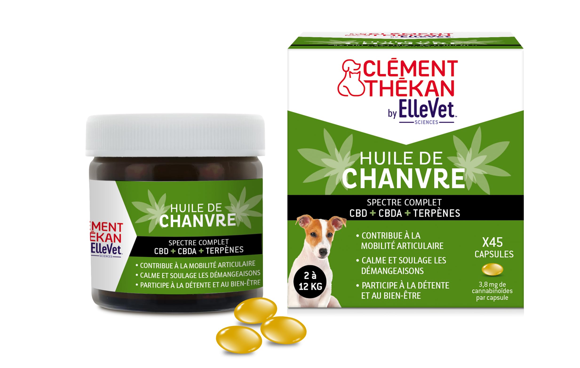 CLÉMENT THÉKAN - HEMP OIL FOR DOGS FROM 2 TO 12 KG Contributes to joint mobility, promotes good joint function. Soothes and relieves itching. Contributes to the relaxation and well-being of dogs. Full spectrum hemp oil: containing cannabidiol (CBD), cannabidiol acid (CBDA) and terpenes naturally present in the hemp plant. 45 capsules 3.8 mg of cannabinoids per capsule INGREDIENTS COMPOSITION (per capsule): ElleVet™ Full Spectrum Hemp Oil 6 mg (contains 3.8 mg of Cannabinoids), Hemp Seed Oil, Sunflower Lecithin. ANALYTICAL CONSTITUENTS: Fat: 96.6 , Moisture: 0.25 , Crude fiber: DIRECTIONS FOR USE PRECAUTIONS FOR USE: Store at a temperature below 25 C, away from sunlight. Keep out of the sight and reach of children and animals. Not recommended for pregnant or lactating females. If the animal's condition deteriorates or remains unchanged, stop administering the capsules and consult your veterinarian. EASY TO USE: The Hemp Oil range has been specially designed for dogs to ensure easy and precise intake. FULL SPECTRUM HEMP OIL: Contains 3.8 mg of cannabinoids per capsule, including cannabidiol (CBD), cannadidiolic acid (CBDA) and terpenes naturally present in the hemp plant. CONTRIBUTES TO RELAXATION AND WELL-BEING: Recommended in cases of stress and or agitation. Suitable for older animals. CALM AND RELIEVE ITCHING. CONTRIBUTES TO JOINT MOBILITY: Clément Thékan Hemp Oil promotes healthy joint function. CLÉMENT THÉKAN - HUILE DE CHANVRE CHIEN DE 2 À 12 KG Contribue à la mobilité articulaire, favorise un bon fonctionnement des articulations. Calme et soulage les démangeaisons. Participe à la détente et au bien-être des chiens. Huile de chanvre à spectre complet : contenant du cannabidiol (CBD), de l'acide de cannabidiol (CBDA) et des terpènes naturellement présents dans la plante de chanvre. 45 capsules 3,8 mg de cannabinoïdes par capsule INGRÉDIENTS COMPOSITION (par capsule) : Huile de Chanvre spectre complet ElleVet™ 6 mg (contient 3,8 mg de Cannabinoïdes), Huile de graines de Chanvre, Lécithine de Tournesol. CONSTITUANTS ANALYTIQUES : Matières grasses : 96,6 , Humidité : 0,25 , Fibres brutes : MODE D'EMPLOI PRÉCAUTIONS D'EMPLOI : À conserver à une température inférieure à 25 C, à l'abri du soleil. Tenir hors de la vue et de la portée des enfants et des animaux. Déconseillé aux femelles gestantes ou allaitantes. Si la condition de l'animal se dégrade ou reste inchangée, arrêter l'administration des capsules et consulter votre vétérinaire. FACILE D'UTILISATION : La gamme Huile de chanvre a été spécialement conçue pour les chiens afin d'assurer une prise facile et précise. HUILE DE CHANVRE À SPECTRE COMPLET : Contient 3,8 mg de cannabinoïdes par capsule, dont cannabidiol (CBD), acide de cannadidiol (CBDA) et terpènes naturellement présents dans la plante de chanvre. PARTICIPE À LA DÉTENTE ET AU BIEN-ÊTRE : Conseillées en cas de stress et ou d'agitation. Convient aux animaux âgés. CALME ET SOULAGE LES DÉMANGEAISONS. CONTRIBUE À LA MOBILITÉ ARTICULAIRE : L'Huile de chanvre Clément Thékan favorise un bon fonctionnement des articulations.