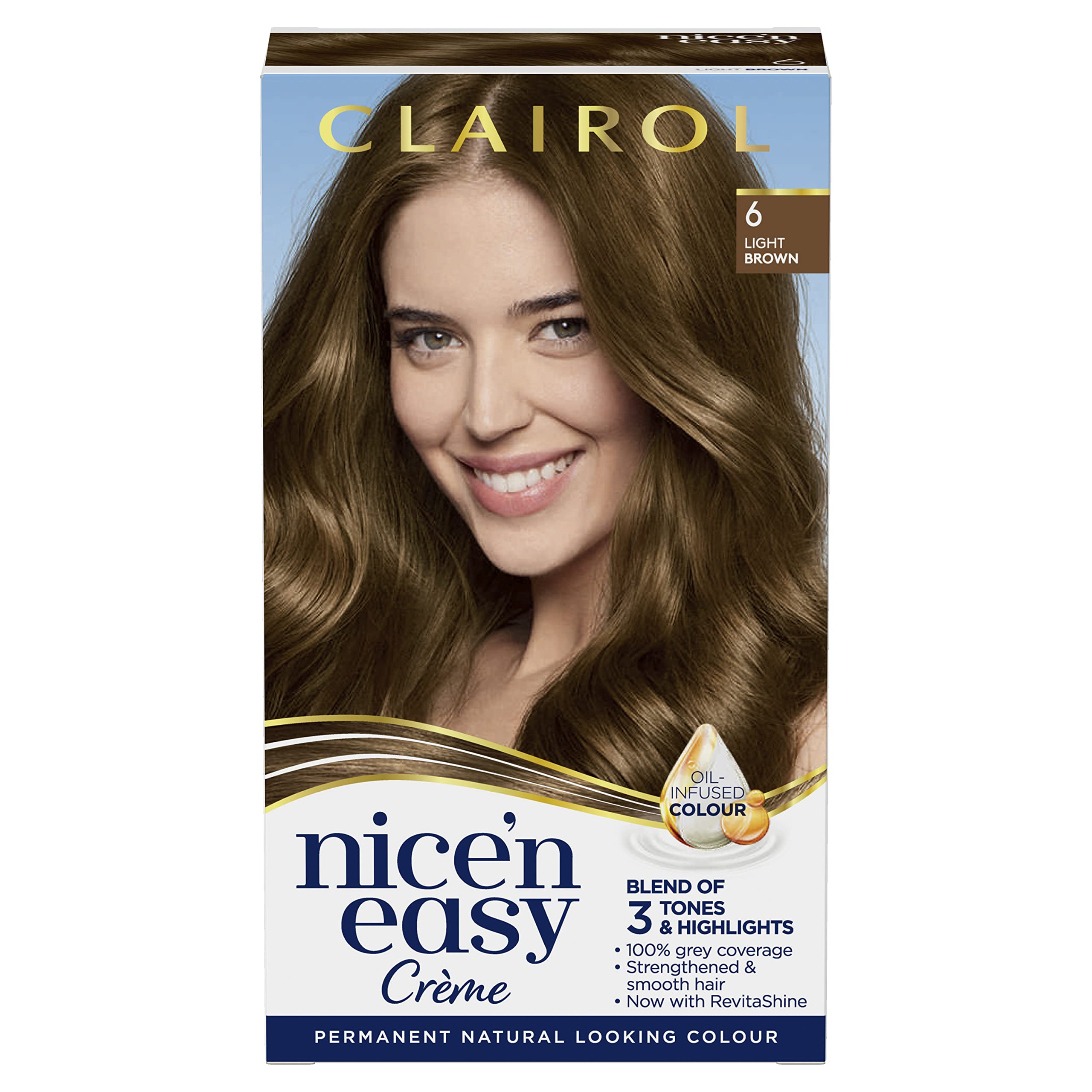 Discover Clairol Nice'n Easy Crème, a natural looking permanent home hair colour, with a blend of 3 tones and highlights and conditioners at every step. Nice'n Easy Crème is gentle on hair and scalp due to its oil infused colour. It provides 100% grey coverage, with soft and shiny results. 96% of women would recommend to a friend. Colour as real as you are! INGREDIENTS Colour Crème: Aqua/ Water/ Eau, Propylene Glycol, Cetearyl Alcohol, Trisodium Ethylenediamine Disuccinate, Ammonia, 2-methoxymethyl-p-phenylenediamine, Parfum/ Fragrance, Ammonium Sulfate, Sodium Sulfate, Resorcinol, Sodium Sulfite, P-aminophenol, Dicetyl Phosphate, 4-amino-2-hydroxytoluene, Ascorbic Acid, Ceteth-10 Phosphate, Steareth-200, Sodium Hydroxide, M-aminophenol, 2-methylresorcinol, Xanthan Gum, Ci 77891/ Titanium Dioxide, Disodium Edta, Linalool, N,n-bis(2-hydroxyethyl)-p-phenylenediamine Sulfate, Colour Activator: Aqua/water/eau, Paraffinum Liquidum/ Mineral Oil/ Huile Minerale, Hydrogen Peroxide, Cetearyl Alcohol, Sodium Cetearyl Sulfate, Salicylic Acid, Disodium Phosphate, Phosphoric Acid, Disodium Pyrophosphate, Sodium Stannate, Etidronic Acid, Cc+ Colourseal Conditioner: Aqua/water/eau, Bis-hydroxy/methoxy Amodimethicone, Stearyl Alcohol, Cetyl Alcohol, Stearamidopropyl Dimethylamine, Malic Acid, Glutamic Acid, Parfum/fragrance, Benzyl Alcohol, Benzyl Benzoate, Edta, Histidine, Cocos Nucifera (Coconut) Oil, Sodium Chloride, Hexyl Cinnamal, Linalool, Magnesium Nitrate, Trimethylsiloxysilicate, Aloe Barbadensis Leaf Juice, Methylchloroisothiazolinone, Magnesium Chloride, Methylisothiazolinone, Bht, Ascorbic Acid, Citric Acid, Potassium Sorbate, Sodium Benzoate, Sodium Sulfite SAFETY WARNING Caution: hair colourants can cause severe allergic reactions. Read and follow instructions. This product is not intended for use on persons under the age of 16. Temporary “black henna” tattoos may increase your risk of allergy. Do not colour your hair if: - you have a rash on your face or sensitive, irritated and damaged scalp, - you have ever experienced any reaction after colouring your hair, - you have experienced a reaction to a temporary “black henna” tattoo in the past. In case of any reaction or when in doubt consult a doctor before using any hair colour product. Rinse hair well after application. Avoid contact with eyes. Rinse eyes immediately if product comes into contact with them. Do not use to dye eyelashes or eyebrows. Wear suitable gloves. Keep out of reach of children See moreLong-lasting hair colour that lasts up to 28 washes. Gentle on hair and scalp. Oil infused hair dye delivering soft and shiny results. Natural looking colour with a blend of 3 salon tones and highlights in 1 simple step. Permanent colour crème hair dye.
