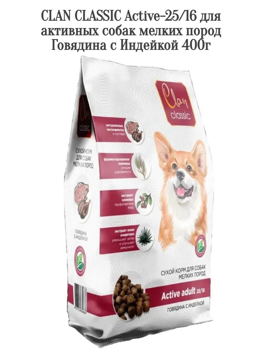 | Полное наименование товара | CLAN CLASSIC Active-25/16 для активных собак мелких пород Говядина с Индейкой 400г |