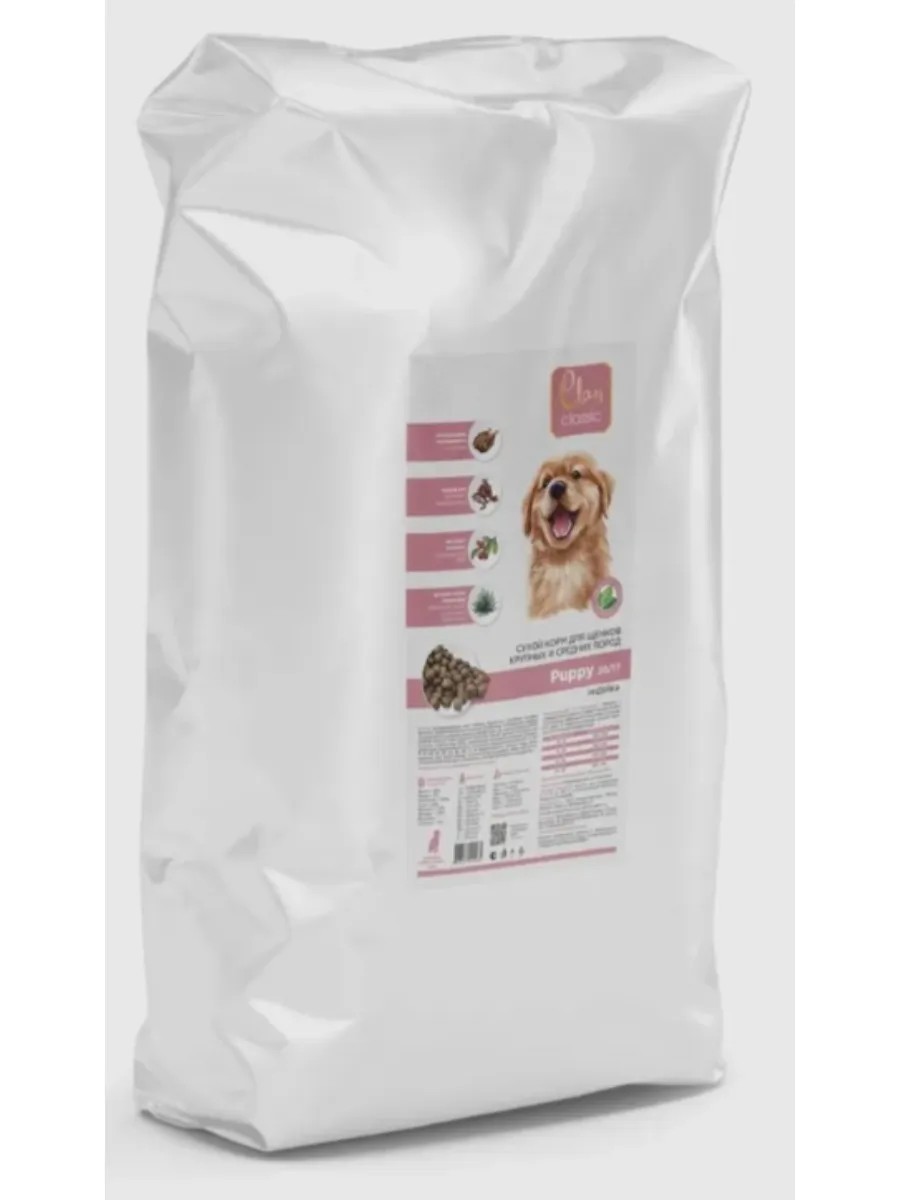 Clan Classic Puppy 30/17 dry food with turkey for puppies of large and medium breeds. Key benefits: - Premium class; - Natural composition: no artificial preservatives or flavors; - Wide range of flavors; - Fermented wheat or brown rice in the composition promote better digestibility and improves digestion; - Unique taste: turkey with shrimp!; - Contains a complete set of all vital vitamins, minerals, antioxidants and amino acids; - Contains Yucca Schidigera extract: reduces odor and improves immunity. INGREDIENTS: Dehydrated turkey meat, brown rice (source of dietary fiber), fermented wheat, poultry fat, turkey by-products, dried sugar beet pulp (improves gastrointestinal tract function), flaxseed (source of Omega-3, Omega-6), brewer's yeast (natural source of prebiotics MOS), natural flavors, fish oil, sunflower oil, vitamin and mineral complex: A, D3, E, B1, B2, B3, B4, B5, B6, B12, C, H; trace elements: iron, copper, zinc, manganese, iodine, selenium, cranberry; Yucca Schidigera extract, lysine, methionine, natural antioxidant, glucosamine, rosemary extract, chondroitin. Nutritional value: Proteins not less than 30%; Fats not less than 17%; Fiber no more than – 2.69%; Ash no more than – 6.84%; Calcium not less than – 1.70%; Phosphorus no less – 1.35%; Humidity – 10%. Additives: Vitamins: A – 15,000 IU/kg, D3 – 1,500 IU/kg, E – 500 mg/kg, B1 – 4 mg/kg, B2 – 3.8 mg/kg, B3 – 15 mg/kg, B4 – 2,480 mg/kg, B5 – 20 mg/kg, B6 – 25 mg/kg, B12 – 0.1 mg/kg, C – 100 mg/kg, H – 2.7 mg/kg. Microelements: Iron – 91 mg/kg; Iodine – 1.6 mg/kg; Manganese – 33.6 mg/kg; Copper – 10.3 mg/kg; Selenium – 0.1 mg/kg; Zinc – 107.8 mg/kg. Energy value: 382 kcal/100 g.