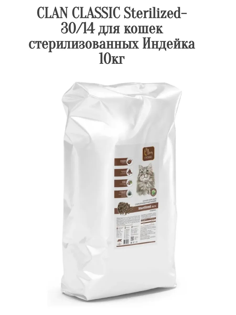 | Полное наименование товара | CLAN CLASSIC Sterilized-30/14 стерилизованных кошек Индейка 10кг |