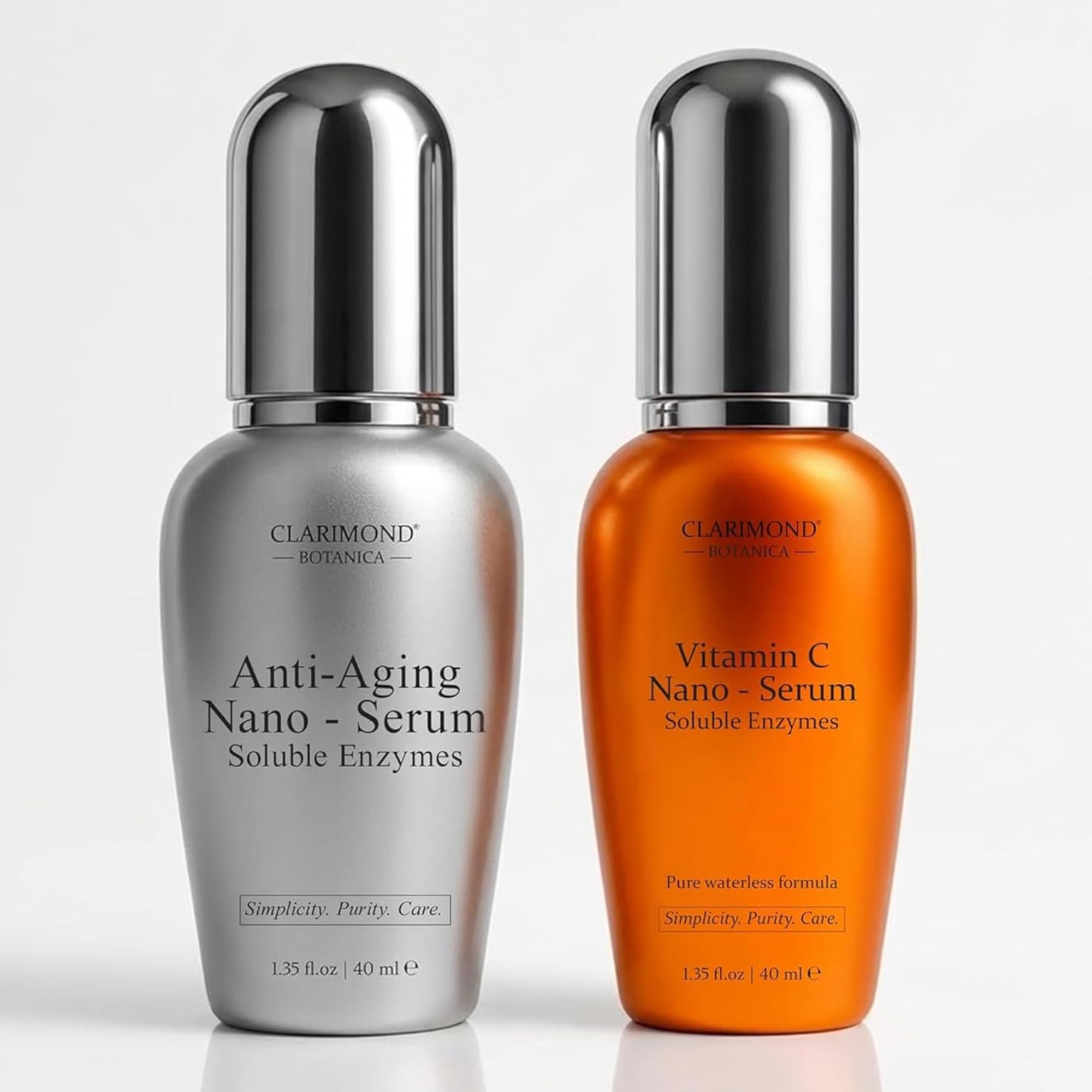 Clarimond dual serum bundle pairs two complementary face serums designed to support visible radiance, hydration, and skin-barrier integrity. The Vitamin C Serum helps refine the look of uneven tone and dullness using stabilized vitamin C and fermented botanicals. The Pro-Xylane Peptide Serum focuses on hydration, elasticity, and surface smoothness with peptides and skin-supporting humectants. Lightweight textures layer easily for a streamlined, minimalist routine suitable for daily use. , : Clarimond serums are vegan, cruelty-free, and formulated without parabens, phthalates, sulfates, or synthetic dyes. Designed with a minimalist ingredient philosophy and dermatologist-aligned standards, this face serum bundle supports consistent, uncomplicated skincare routines. , : Both serums feature lightweight textures designed for layering in multi-step skincare routines. Suitable for normal, dry, combination, and sensitive-leaning skin, this facial serum bundle supports daily hydration and barrier comfort without clogging pores or greasy feel. - : This peptide face serum is formulated with Pro-Xylane, collagen-supporting ingredients, and humectants to help maintain hydration and elasticity. Designed to support skin softness and surface smoothness, it complements antioxidant serums without heaviness or irritation. - : The Vitamin C face serum uses stabilized vitamin C with fermented botanicals to help improve the appearance of dullness and uneven tone. Lightweight and fast absorbing, it layers easily under moisturizer or sunscreen without residue, supporting a smoother, more refined look. : Two complementary face serums designed to support radiance, hydration, and skin-barrier balance. This serum set pairs a Vitamin C facial serum with a peptide and Pro-Xylane hydration serum for a streamlined morning and evening skincare routine suitable for all skin types.