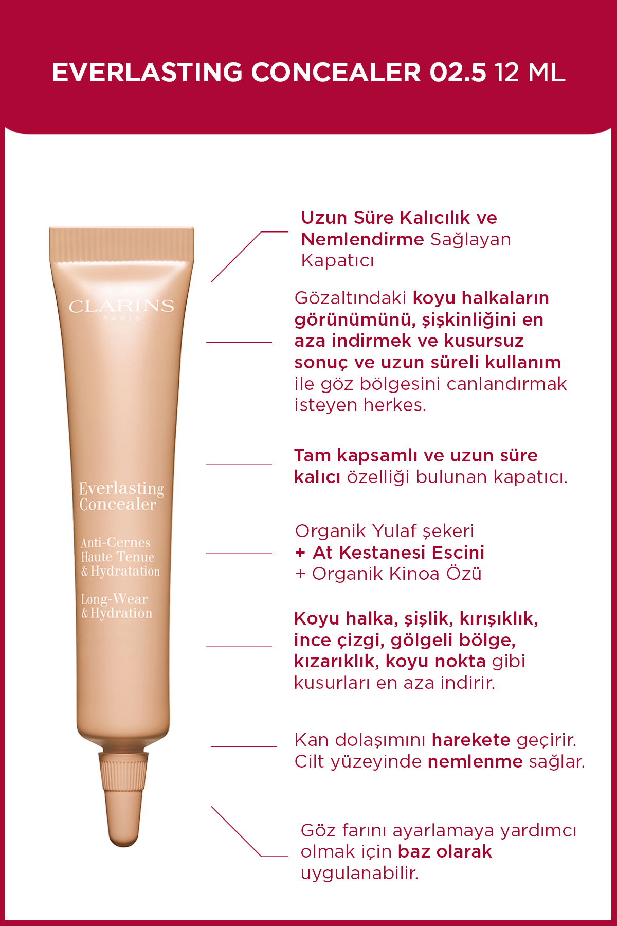 Sagladigi Avantajlar : - Kapatici - Tüm cilt tipleri için önerilir - Yagli degil - Taze ve dinlenmis bir görünüm verir - Yüksek opaklik - Uzun ömürlü - Koyu halkalari, kirleri ve güzellik kusurlarini kapsar - Organik kinoa ve at kestanesi ile zenginlestirilmistir - Göz altinda dolasimi iyilestirir - Koyu halkalari önler - Clarins'in patentli Kirlilik Karsiti Kompleks ile olusturulmustur - Koruyucu etkisi vardir