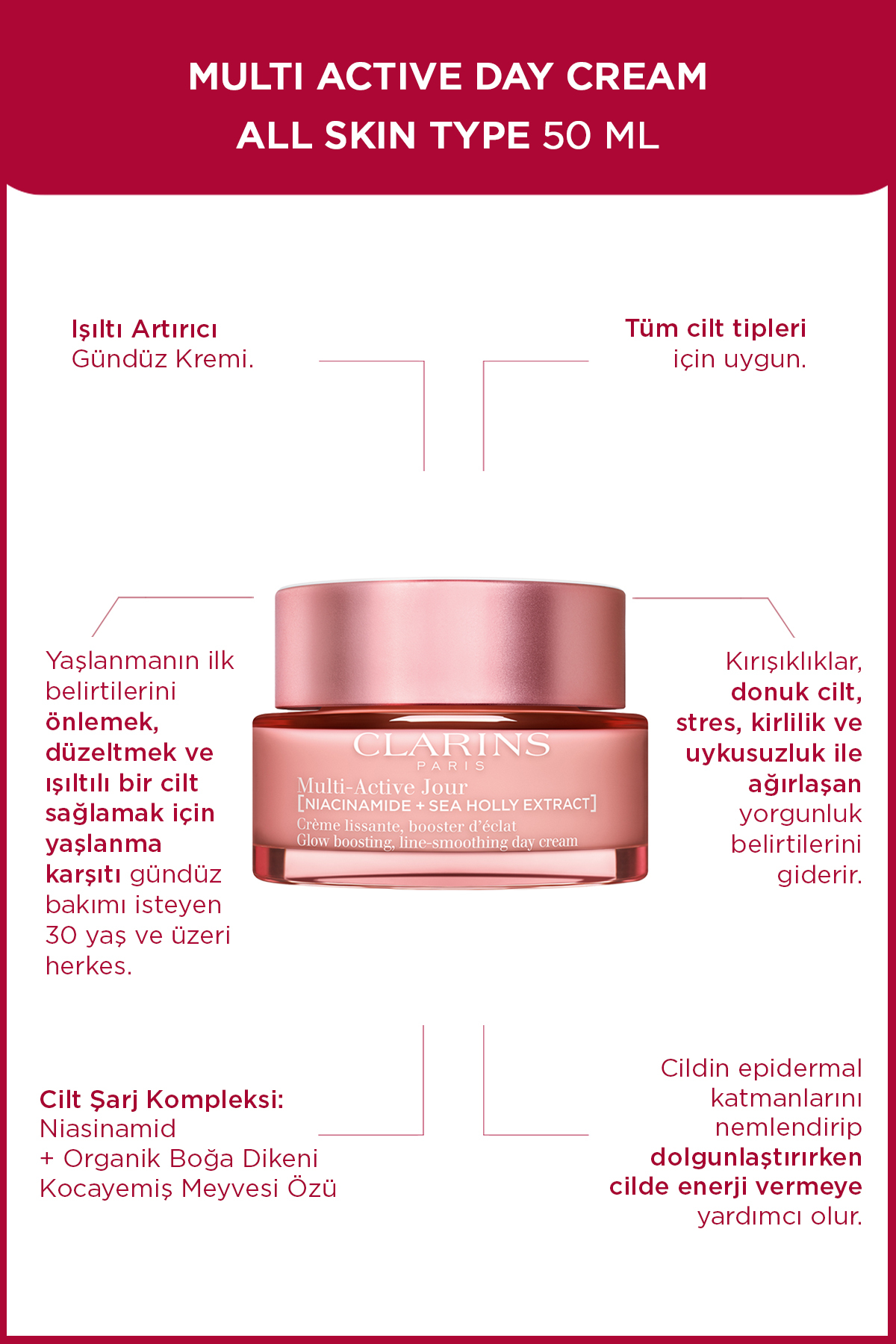 Cardera özü ve betainile zenginlestirilmis formülü, epidermal katmanlari nemlendirip dolgunlastirirken cilde enerji vermeye yardimci olur.
