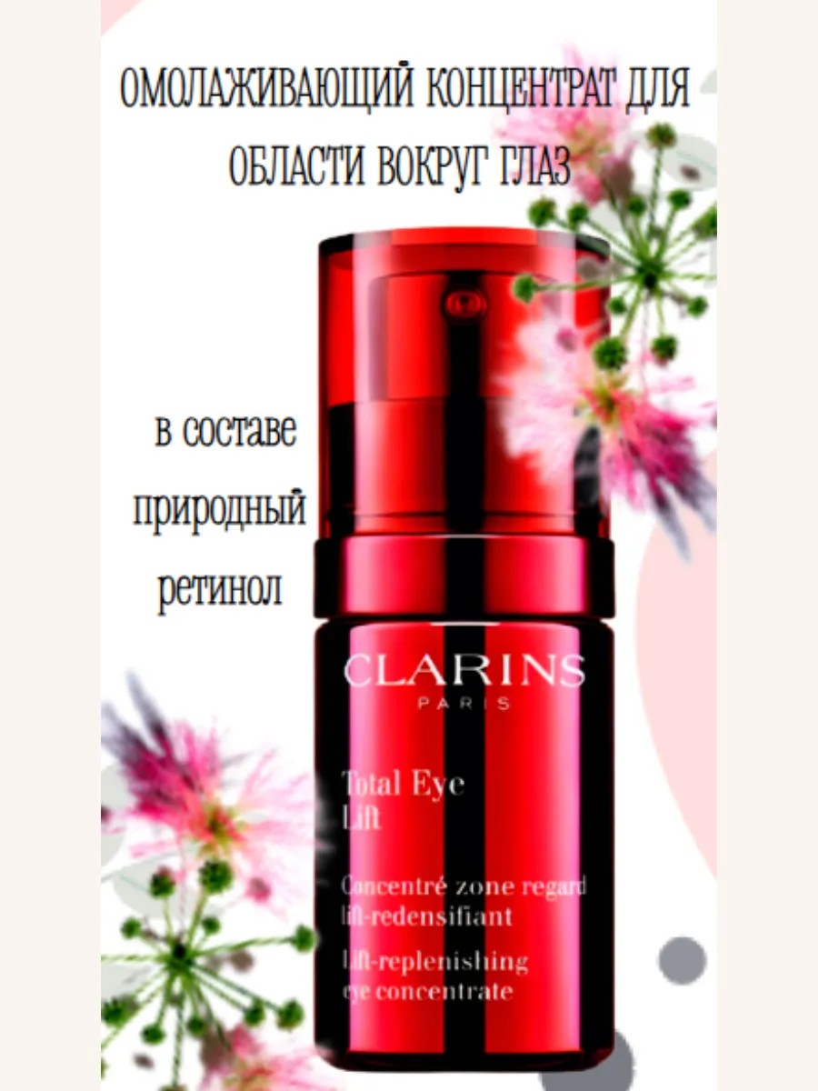 Омолаживающий концентрат с эффектом лифтинга для кожи вокруг глаз Clarins Total Eye Lift, 15 мл обеспечивает эффективную подтяжку кожи вокруг глаз, кожа уплотняется, морщины даже глубокие заполняются и разглаживаются.