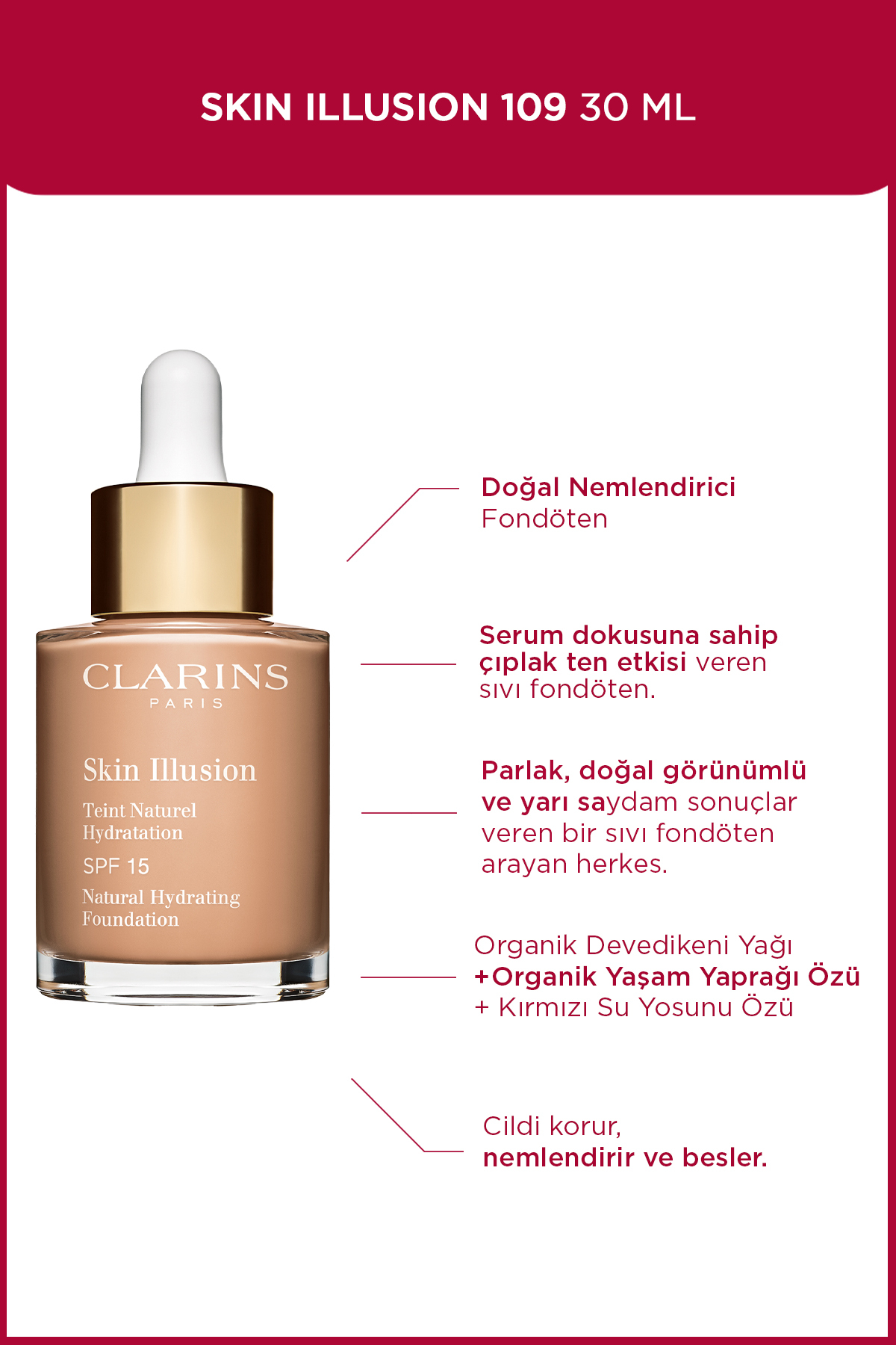How to use Clarins Skin Illusion Foundation?Just a few drops are enough for an instant enhancement. Thanks to its silky texture, it seamlessly adapts to your face, nourishing and brightening your skin without feeling heavy. Apply a few drops to a brush, sponge or your fingertips and apply to your skin.