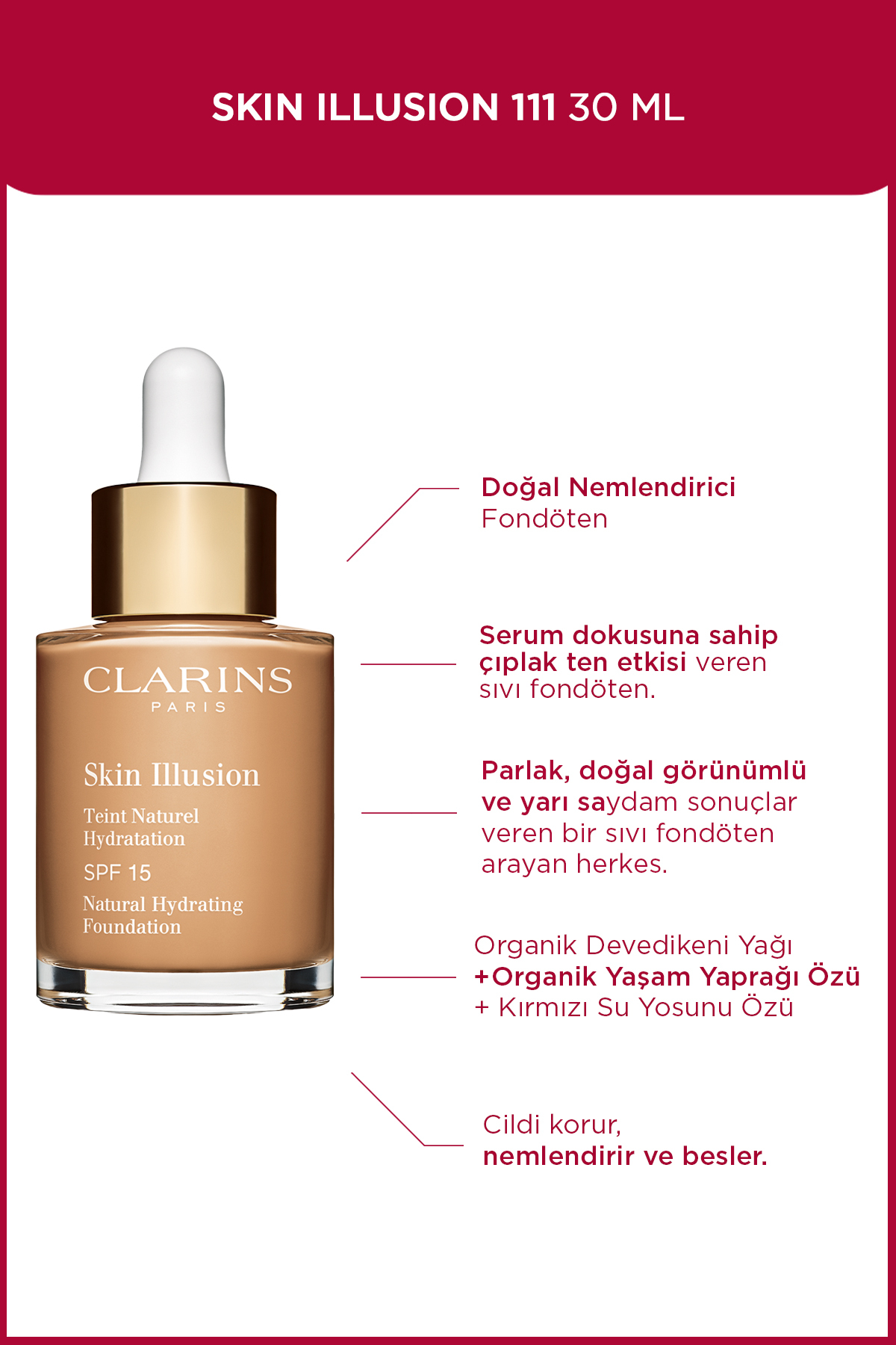 How to use Clarins Skin Illusion Foundation?Just a few drops are enough for an instant enhancement. Thanks to its silky texture, it seamlessly adapts to your face, nourishing and brightening your skin without feeling heavy. Apply a few drops to a brush, sponge or your fingertips and apply to your skin.