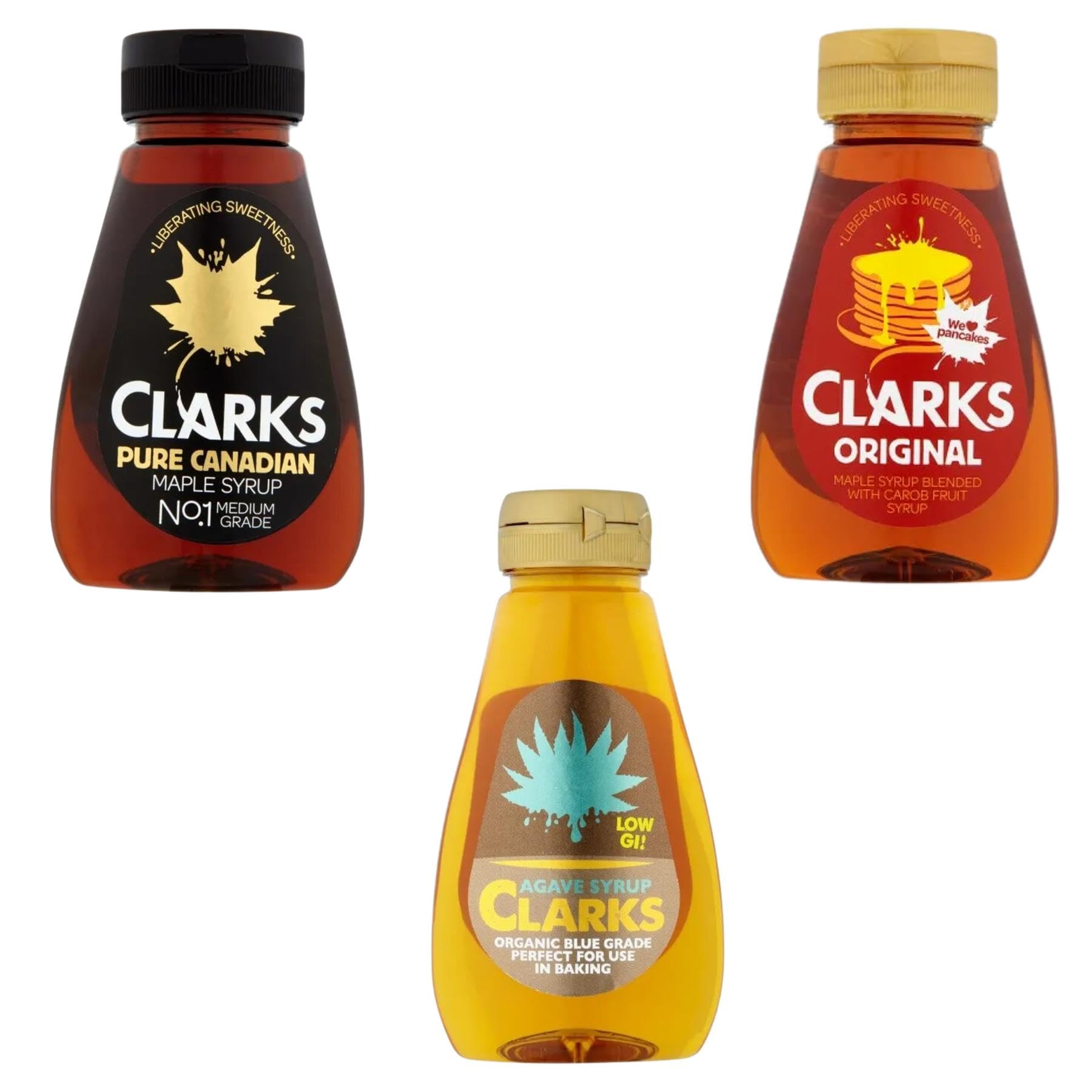 Maple Syrup Blended with Carob Fruit Syrup A natural blend of Pure Canadian Maple Syrup and Carob Fruit Syrup Maple Sap is boiled to create a Pure Maple Syrup that we then blend in the UK with Carob Fruit Syrup which is extracted from the Mediterranean Carob Fruit. Indulge in the delightful sweetness of Clarks Syrup. This bottle contains a luscious golden syrup that's perfect for drizzling over your favorite breakfast treats or desserts. Made with high-quality ingredients and crafted with care, Clarks Syrup promises a rich flavor experience that elevates every bite.Whether you're enjoying a stack of fluffy pancakes, crispy waffles, or a bowl of creamy porridge, Clarks Syrup adds a touch of indulgence to your meal. Its smooth consistency makes it easy to pour and spread, ensuring every mouthful is infused with delicious sweetness. Treat yourself and your loved ones to the unmatched taste of Clarks Syrup. From lazy weekend brunches to impromptu dessert creations, this syrup is sure to become a beloved staple in your kitchen.