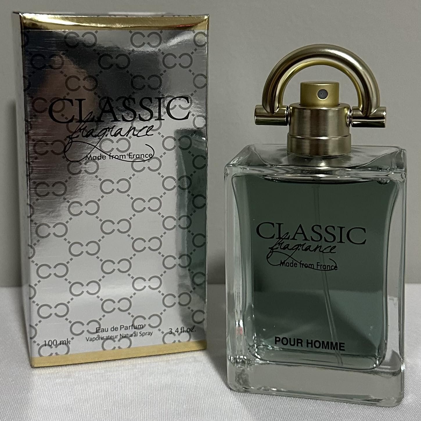 CONVENIENT SIZE: 100 ml/3.4 fl oz natural spray bottle perfect for daily use or travel. POUR HOMME: Specifically formulated as a men's fragrance, delivering a classic masculine scent profile. PACKAGING: Comes in a sophisticated silver box with signature pattern design and gold accents for an upscale presentation. LUXURIOUS DESIGN: Premium glass bottle with a distinctive gold-tone handle-style cap and modern rectangular shape for an elegant presentation. FRENCH CRAFTSMANSHIP: Elegant eau de parfum crafted and produced in France, featuring a sophisticated blend of fragrances in a 3.4 fl oz bottle.
