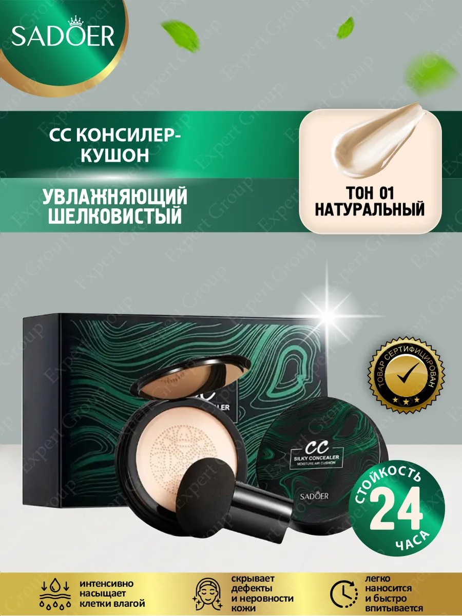 Увлажняющий шелковистый консилер-кушон Sadoer тон 01 Натуральный 20 гр. Увлажняющий консилер СС с шелковой текстурой для лица подходит для любого типа кожи, легко наносится и быстро впитывается, не оставляя чувства липкости и дискомфорта. Консилер выравнивает микрорельеф, маскирует легкие покраснения, незначительные дефекты и изъяны кожи, улучшает цвет лица. Минеральные масла в составе средства питают ткани необходимыми витаминами и микроэлементами, делая кожу гладкой, чистой и ухоженной. Крем интенсивно насыщает клетки влагой, препятствуя появлению сухости и шелушений, разглаживает неглубокие морщинки, повышает упругость и эластичность кожи, подтягивает овал лица. Регулярное использование консилера поможет не только скрыть дефекты и неровности поверхности кожи, но и улучшит ее общее состояние, приведет в тонус, сделает ее свежей, молодой и сияющей. Способ применения: 1. Перед применением рекомендуется 1-2 раза очистить спонж, слегка надавить и взять необходимое количество средства 2. Нанести крем на лицо движениями сверху-вниз несколько раз 3. Равномерно распределить средство по всему лицу 4. Нанести средство вторым слоем на те участки лица, которые нуждаются в этом.