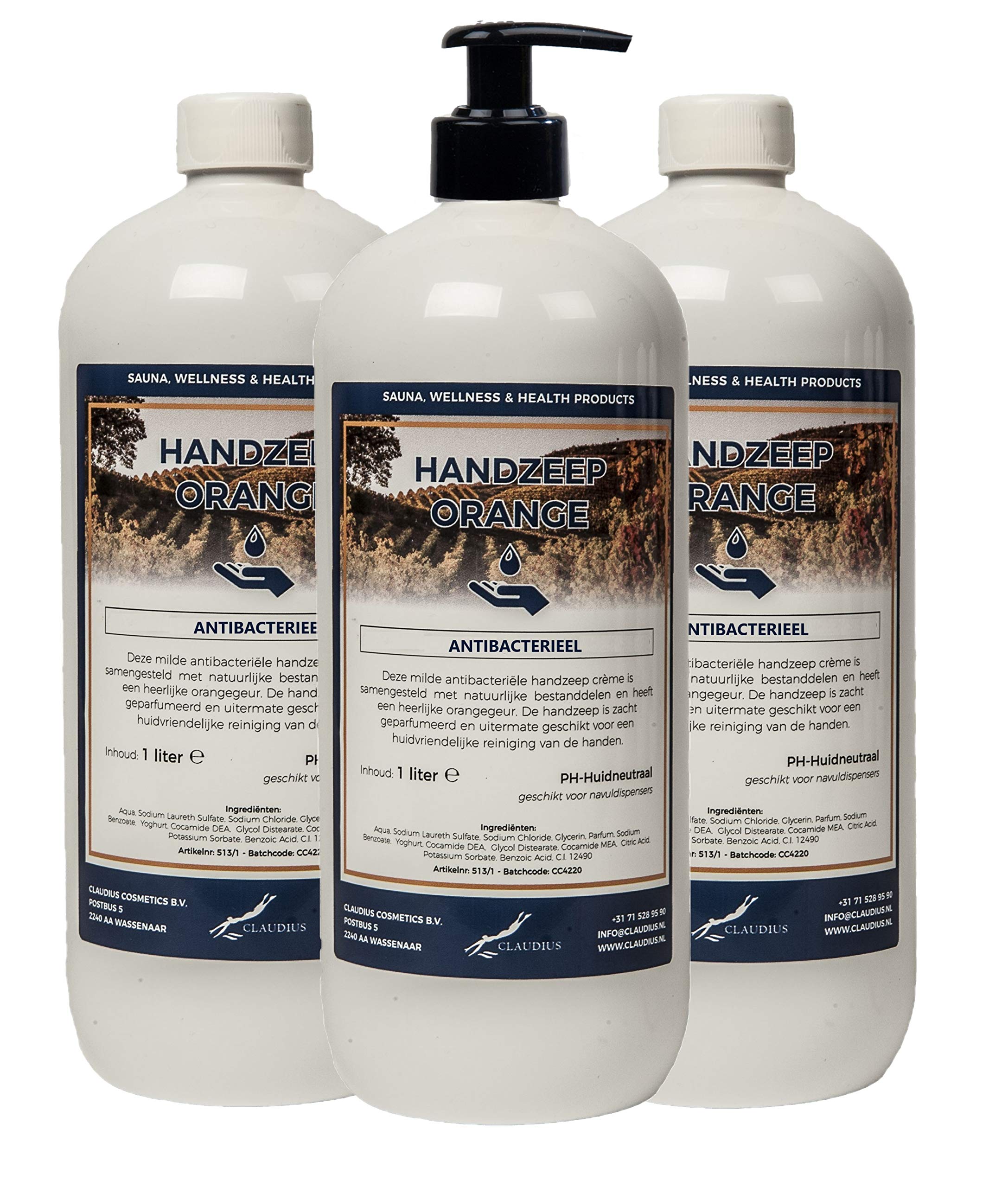 This antibacterial hand soap is formulated with specifically selected ingredients and a delicious orange scent. The hand soap is softly perfumed and ideal for mild cleaning of the hands. The skin remains soft and supple and is well cared for. Claudius Hand Soap Orange is PH skin neutral. Claudius Cosmetics.Mild cleaning. PH skin neutral. Orange scent. Antibacterial.Handzeep Orange 3 x 1 liter - met gratis pomp Deze antibacteriële handzeep is samengesteld met specifiek geselecteerde bestanddelen en een heerlijke orangegeur. De handzeep is zacht geparfumeerd en uitermate geschikt voor de milde reiniging van de handen. De huid blijft zacht en soepel en wordt goed verzorgd. Claudius Handzeep Orange is PH-huidneutraal. Claudius Cosmetics.Milde reiniging. PH-huidneutraal. Orangegeur. Antibacterieel.