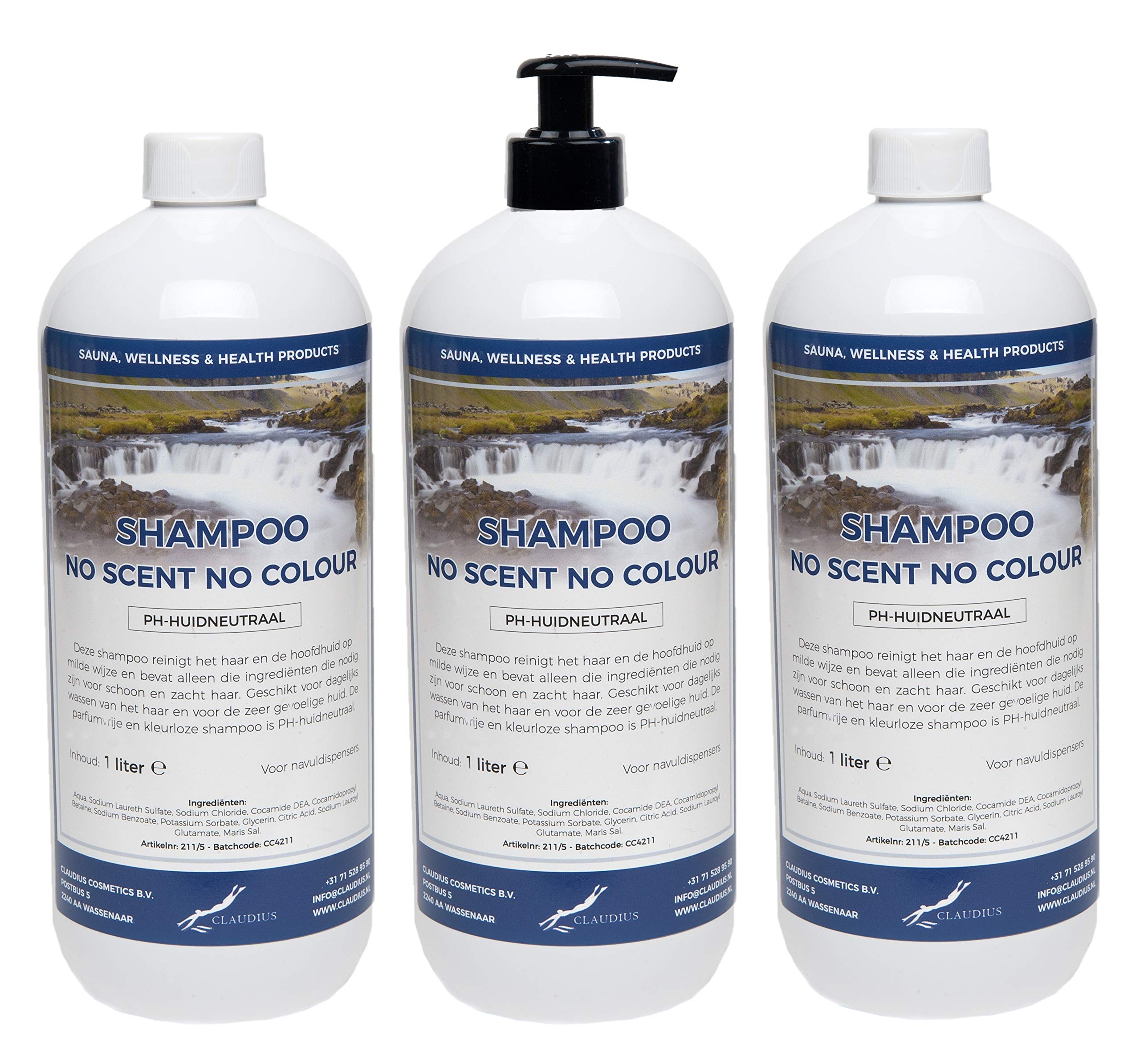 Shampoo No Scent No Color offers mild cleansing and is enriched with natural ingredients. After exercise or sauna, it provides a refreshed feeling without odor or color. This shampoo hydrates, refreshes and revitalizes, and is suitable for all hair types. The shampoo is intensively caring, PH skin neutral and respects the natural balance of the scalp. For an extra caring effect, you can end your hair care with a conditioner that is soft and moisturizing. Key Features of Shampoo No Scent No Color Natural Ingredients: Gentle on the hair, without harmful chemicals, parabens or sulfates. Odorless and colorless: No fragrance or colorants added. Vegan and not tested on animals: Ethically produced, without animal products or testing on animals. Skin-friendly: Suitable for daily use and respects the natural balance of the scalp. PH skin neutral: Provides gentle cleansing without drying out the skin or hair. Use of Shampoo No Scent No Color 1 Apply the shampoo to wet hair. 2 Massage gently to cleanse the hair and activate the foam. 3 Rinse thoroughly with water and repeat if necessary. 4 Finish with a nourishing conditioner for extra nourishment and softness. INGREDIENTS Aqua, Sodium Laureth Sulfate, Sodium Chloride, Cocamide DEA, Cocamidopropyl Betaine, Sodium Benzoate, Potassium Sorbate, Glycerin, Citric Acid, Sodium Lauroyl Glutamate, Maris SalPH neutral. Suitable for very sensitive skin. Gently cleanses hair and skin.Shampoo No Scent No Colour 3 x 1 liter - met gratis pomp Shampoo No Scent No Colour biedt een milde reiniging en is verrijkt met natuurlijke ingrediënten. Na het sporten of sauna zorgt het voor een verkwikt gevoel zonder geur of kleur. Deze shampoo hydrateert, verfrist en revitaliseert, en is geschikt voor elk haartype. De shampoo is intensief verzorgend, PH-huidneutraal en respecteert de natuurlijke balans van de hoofdhuid. Voor een extra verzorgend effect kun je de haarverzorging afsluiten met een conditioner die zacht en hydraterend is. Belangrijkste Kenmerken van Shampoo No Scent No Colour Natuurlijke ingrediënten: Zacht voor het haar, zonder schadelijke chemicaliën, parabenen of sulfaten. Geur- en kleurlos: Geen geur of kleurstoffen toegevoegd. Vegan en dierproefvrij: Ethisch geproduceerd, zonder dierlijke producten of testen op dieren. Huidvriendelijk: Geschikt voor dagelijks gebruik en respecteert de natuurlijke balans van de hoofdhuid. PH-huidneutraal: Zorgt voor een zachte reiniging zonder de huid of het haar uit te drogen. Gebruik van Shampoo No Scent No Colour 1 Breng de shampoo aan op nat haar. 2 Masseer het zachtjes in om het haar te reinigen en het schuim te activeren. 3 Spoel grondig af met water en herhaal indien nodig. 4 Eindig met een verzorgende conditioner voor extra voeding en zachtheid. INGREDIËNTEN Aqua, Sodium Laureth Sulfate, Sodium Chloride, Cocamide DEA, Cocamidopropyl Betaine, Sodium Benzoate, Potassium Sorbate, Glycerin, Citric Acid, Sodium Lauroyl Glutamate, Maris SalPH-neutraal. Geschikt voor de zeer gevoelige huid. Reinigt haar en huid op milde wijze.