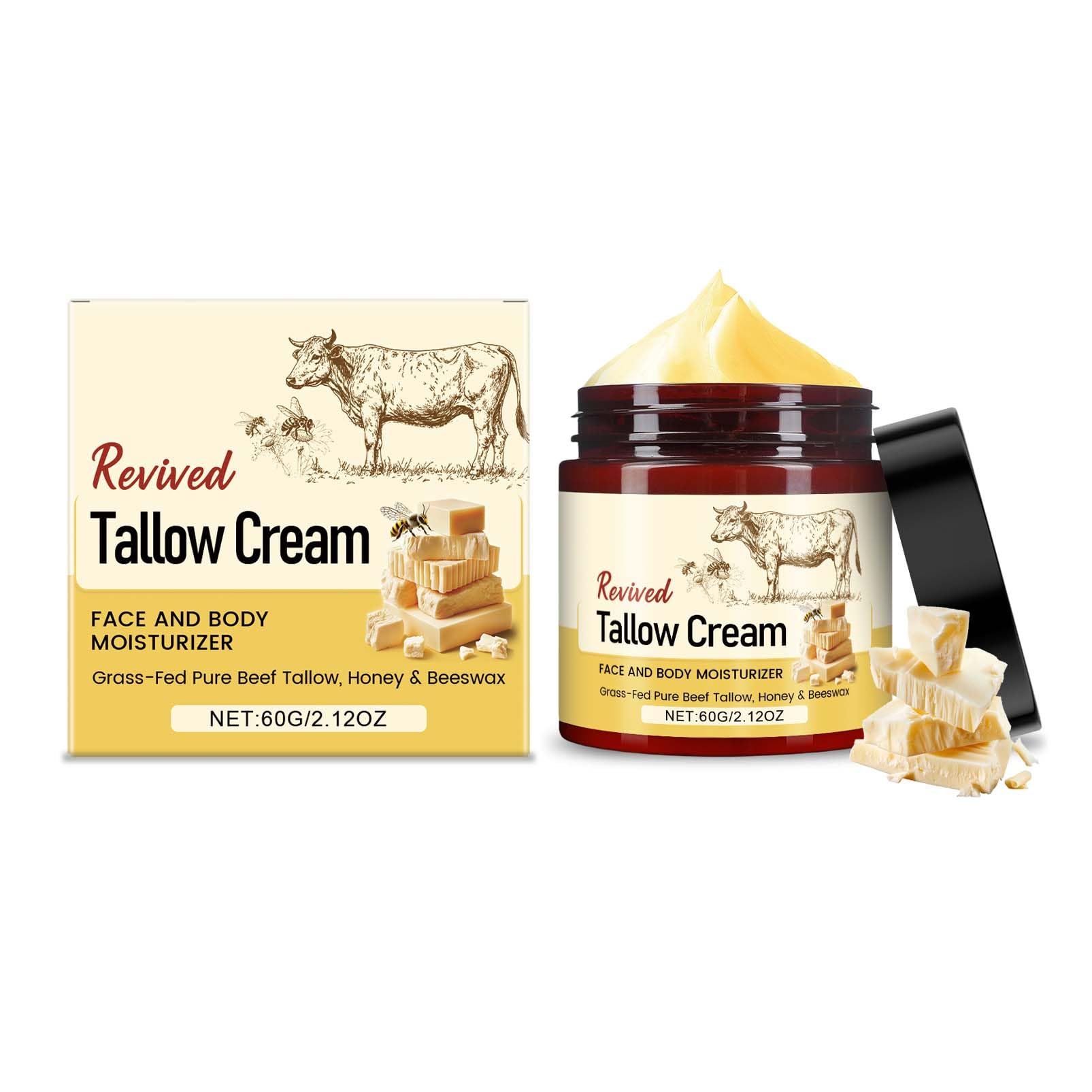 Experience the transforming power of nature with our Clawrex organic beef tallow cream. Made from 100 organic, grass-fed beef tallow and pure, natural honey, this cream is the most original and effective form of skin care. It not only provides your skin with moisture, but sustainably restores and strengthens the skin barrier for a radiant, healthy skin image. Organic quality and naturalness: Our beef tallow comes exclusively from organic cattle that are suitable for the animal species. Free from harmful chemicals, parabens, fragrances and synthetic additives. Just as pure as natural cosmetics should be. Mild ingredients: Specially developed for sensitive and irritating skin. The bio-compatible formula resembles natural skin oil and is optimally tolerated even by sensitive skin. Ideal for the whole family. Nutrient boost for your skin: Sheepstalk intensively cares for the skin, promotes cell renewal and keeps the complexion youthful and radiant. Lightweight, non-greasy texture: Our unique "Whipped" technology gives the cream an airy, light, silky texture. It is absorbed quickly, leaves no greasy feeling or sticky residue and is perfect as a base under make-up. Versatile all-rounder – a cream for everything: The perfect companion for every day. Use it as a nourishing face cream, rich eye care, soothing hand cream, restorative foot cream or nourishing body lotion. Simplify your beauty routine with just one product. Usage: Apply the Clawrex Beef Tallow cream in the morning and or evening to the cleansed face, neck or any desired body part and massage gently. Delivery contents: 1 x Clawrex Bio Beef Tallow cream with honey, 60 gMild Formula: Our fat-honey-tallow face cream is rich in vitamins A, D, K, E and fatty acids. The natural fatty acids in our sebum facial cream strengthen the skin's barrier function, help store moisture and ensure healthy, radiant skin. Beef fat cream is particularly mild for sensitive skin. Fast absorption: the moisturizing face cream made from beef fat has a light texture, is quickly absorbed and leaves no greasy residue. Bio Beef Tallow Skincare suitable for all skin types. Whether you have oily, dry or combination skin. Versatile use: This Beef tallow balm is versatile and can be used not only as a face cream, but also as a hand cream, foot cream or body cream. The light texture of the whipped tallow cream is quickly absorbed and provides long-lasting hydration and protection, ideal for daily use. Deep effective moisturizing care: the beef tallow skincare from willow pose cares for and restores the dry skin barrier, organic beef tallow cream stores moisture, soothes the skin and provides it with moisture, so that it remains healthy and supple. Natural organic Beef Tallow cream: this beef fat cream is made from high-quality organic beef fat from pasture farming. The fat from pastured animals is combined with honey to deeply moisturize the skin, making it supple and elastic and taking full advantage of nature's best benefits.Biologische rundertalg crème, Beef Tallow crème voor lichaam en gezicht, natuurlijke Beef Tallow Skincare met honing bijenwas, diepe hydratatie huid, verhipped tallow balsem, tallow gezichtscrème voor Ervaar de transformerende kracht van de natuur met onze Clawrex biologische beef tallow crème. Gemaakt van 100 biologisch, met gras gevoerd rundertalg en zuivere, natuurlijke honing, is deze crème de meest originele en effectieve vorm van huidverzorging. Het verzorgt je huid niet alleen van vocht, maar herstelt en versterkt duurzaam de huidbarrière voor een stralend gezond huidbeeld. Biologische kwaliteit en natuurlijkheid: Ons rundertalg is uitsluitend afkomstig van biologisch rundvee dat geschikt is voor de diersoort. Vrij van schadelijke chemicaliën, parabenen, geurstoffen en synthetische toevoegingen. Net zo puur als natuurlijke cosmetica zou moeten zijn. Milde ingrediënten: Speciaal ontwikkeld voor de gevoelige en irriterende huid. De bio-compatibele formule lijkt op het natuurlijke huidvet en wordt zelfs door de gevoelige huid optimaal verdragen. Ideaal voor het hele gezin. Voedingsstoffen boost voor je huid: Schapenstalg verzorgt de huid intensief, bevordert de celvernieuwing en houdt de teint jeugdig en stralend. Licht opslaande, niet-vette textuur: Onze unieke "Whipped"-technologie geeft de crème een luchtige, lichte, zijdeachtige textuur. Hij trekt bliksemsnel in, laat geen vetgevoel of kleverige resten achter en is perfect geschikt als basis onder make-up. Veelzijdige alleskunner – een crème voor alles: De perfecte metgezel voor elke dag. Gebruik het als voedende gezichtscrème, rijke oogverzorging, rustgevende handcrème, herstellende voetcrème of voedende bodylotion. Vereenvoudig je schoonheidsroutine met slechts één product. Gebruik: Breng de Clawrex Beef Tallow crème 's ochtends en of 's avonds aan op het gereinigde gezicht, de hals of elk gewenst lichaamsdeel en masseer het zachtjes in. Inhoud levering: 1 x Clawrex Bio Beef Tallow crème met honing, 60 gMilde formule: onze vet-honing-tallow gezichtscrème is rijk aan vitamine A, D, K, E en vetzuren. De natuurlijke vetzuren in onze talg gezichtscrème versterken de barrièrefunctie van de huid, helpen vocht op te slaan en zorgen voor een gezonde, stralende huid. Rundervetcrème is bijzonder mild voor de gevoelige huid. Snelle absorptie: de van rundervet gemaakte vochtinbrengende gezichtscrème heeft een lichte textuur, trekt snel in en laat geen vettige resten achter. Bio Beef Tallow Skincare geschikt voor alle huidtypes. Of je nu een vette, droge of gemengde huid hebt. Veelzijdig gebruik: deze Beef tallow balsem is veelzijdig inzetbaar en kan niet alleen als gezichtscrème, maar ook als handcrème, voetcrème of lichaamscrème worden gebruikt. De lichte textuur van de whipped tallow crème trekt snel in en zorgt voor langdurige hydratatie en bescherming, ideaal voor dagelijks gebruik. Diepe effectieve vochtinbrengende verzorging: de beef tallow skincare uit wilgenho