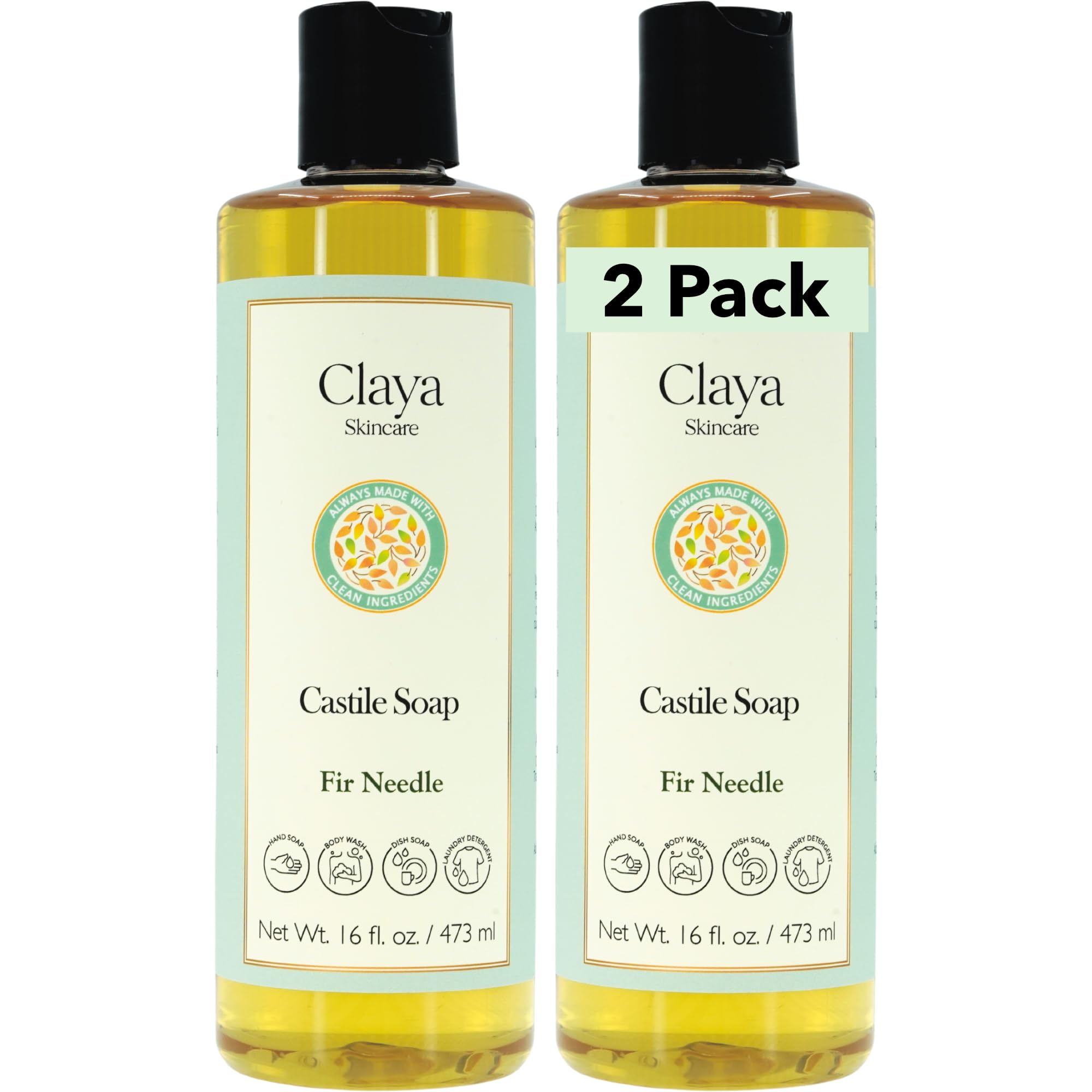 Claya Fir Needle Liquid Castile Soap Organic Ingredients Biodegradable Fresh Forest Scent Gentle for Skin and Multi-Purpose Use(2 Pack of 16 fl oz (Disc Cap))
