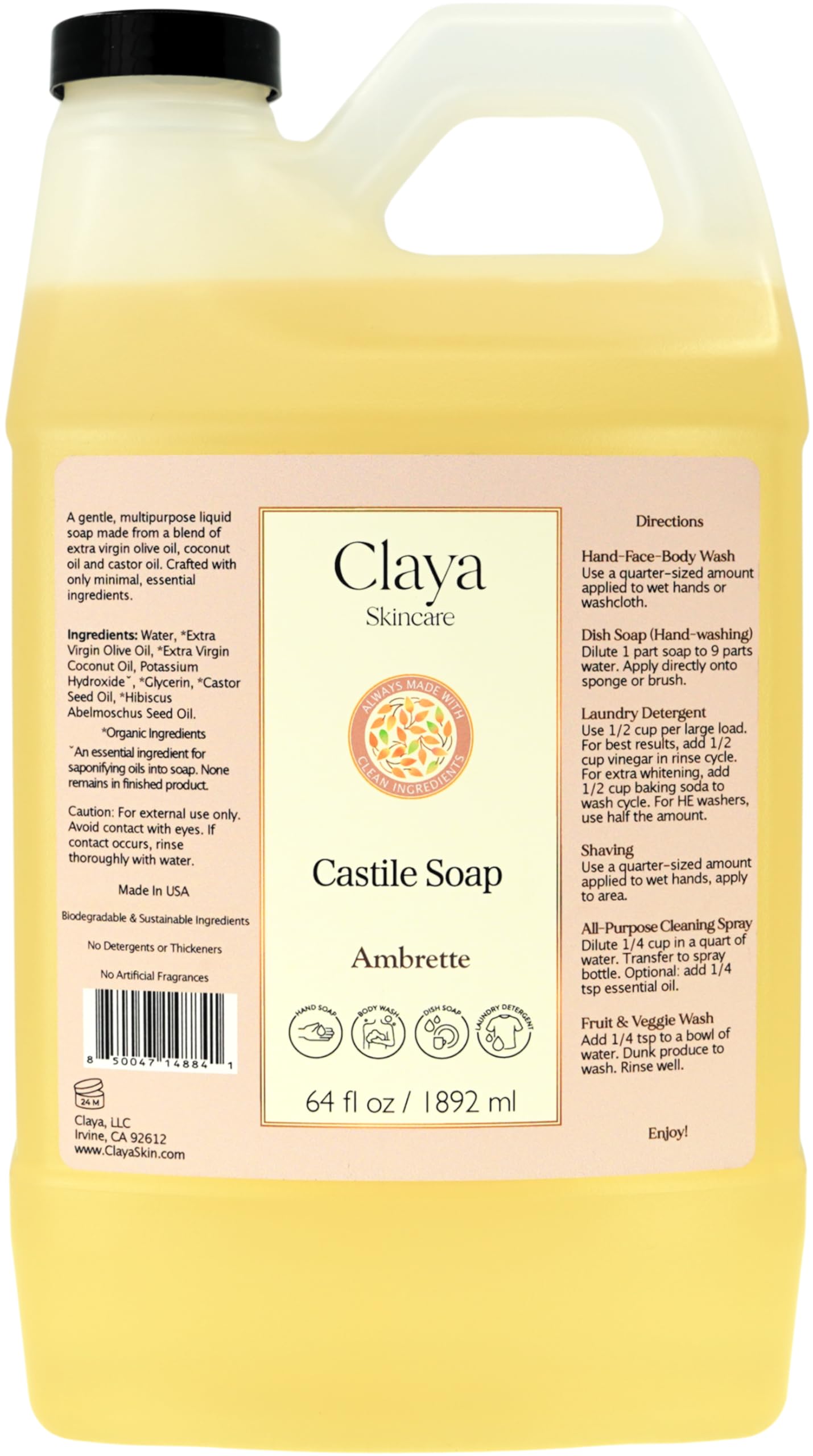Our Ambrette Seed-Infused Liquid Castile Soap draws inspiration from nature's most exquisite botanical treasures, where ambrette seed—often called "vegetable musk"—has been revered for centuries as a rare and precious essence. Sourced from the seeds of Abelmoschus moschatus, this golden oil was once treasured in ancient perfumery and herbal traditions for its uncanny ability to mimic the sensual warmth of animal musk with plant-based elegance. The aroma is irresistibly captivating—softly musky and floral, with nuances of sun-warmed skin, velvety petals, and a delicate hint of pear-like sweetness. As you lather with this soap, the scent wraps around you like a whisper of silk—intimate, luxurious, and subtly intoxicating. It evokes the golden glow of a summer garden at dusk, where flowers release their last sighs of fragrance into the balmy air. Experience the delicate opulence of Ambrette Seed Liquid Castile Soap! The precious oil lends a sophisticated, skin-embracing aroma that lingers like a tender caress—warm, slightly powdery, and infused with a radiant floral-musk glow. Gentle yet profoundly alluring, this soap elevates your daily cleanse into a moment of quiet indulgence. The natural compounds in ambrette seed provide a soothing, skin-loving touch, leaving you refreshed and enveloped in an aura of understated luxury.One Bottle, Endless Possibilities. Claya's Liquid Castile Soap is the powerful, all-natural concentrate that replaces a cabinet full of single-use products. Dilute a little for a gentle face wash, or more for an effective floor cleaner. From shampoo to laundry detergent, one bottle does it all. 100 VEGAN, CRUELTY FREE, and NON-GMO. Claya's Cleansing Soaps are environmentally friendly, made with 100 biodegradable ingredients. We formulate using only natural, plant-based, and renewable resources, ethically sourced for a clean conscience. Our products are—and always will be—cruelty-free. Gentle Cleansing, Powered by Nature. We've formulated our hypoallergenic soap with a blend of three organic oils: Castor, Coconut, and Extra Virgin Olive Oil. Together, they provide a thorough yet non-stripping cleanse, specially designed for sensitive skin and to soothe concerns like eczema and psoriasis. Claya's Castile Soap is made with Organic Sustainable plant-based oils and ingredients, without any fillers! The 30-60-10 Ratio of Organic Olive, Organic Coconut, and Organic Castor Oil produces a cleansing lather without using toxic preservatives or foaming agents. It's good for your skin and even better for the environment: soap made from only pure, biodegradable plant oils. 100 REAL NATURAL Soap from Organic Extra Virgin Olive Oil, Organic Castor Oil, and Organic Coconut Oil. MANUFACTURED IN CALIFORNIA. 100 PALM OIL FREE SOAP! Choose our UNSCENTED Soap for a baby mild formula, free of essential oils and fragrance parfum. 2x more concentrated than ordinary liquid soaps. 100 PCR Recycled plastic bottle!.