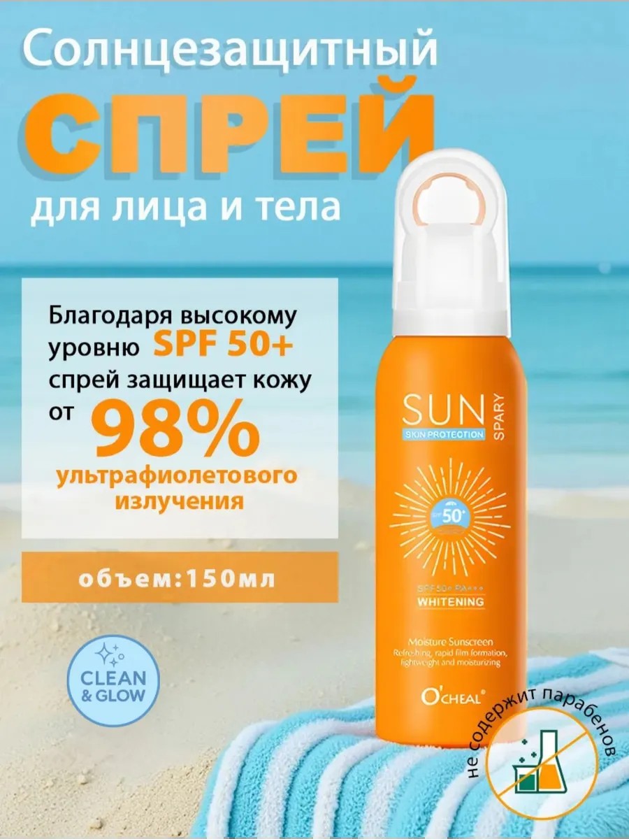 Солнцезащитный спрей от профессионального косметического брендаO'CHEAL — словно нежный щит и оберегающий вашу кожу от безжалостных лучей ультрафиолета, дарит ей ровный золотистый загар. Солнцезащитный спрей SPF 50 — обеспечивает глубокое увлажнение источник молодости и здоровья кожи. Активные органические компоненты, словно эликсир защищают от солнечных ожогов, нежелательной пигментации и кокетливых веснушек. Он предотвращает обезвоживание, избавляя от покраснений и раздражений. Столь деликатный, что подходит даже для нежной кожи подростков, успокаивая ее, как ласковое прикосновение. Этот спрей станет вашим верным, помощником в борьбе за красивую и здоровую кожу. Он не только защищает от солнца, но и увлажняет, питает и успокаивает ее, с уходовым средством для лица и тела почувствуйте как ваша кожа становится более мягкой, гладкой и сияющей, словно наполняется жизненной энергией. Водостойкий спрей для тела идеален для солярия, пляжа или долгих летних прогулок, он станет вашим незаменимым спутником в отпуске.